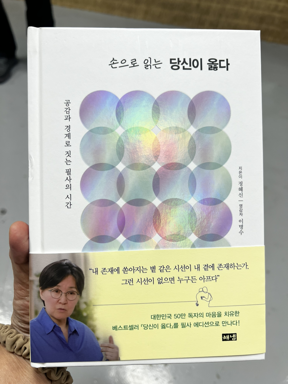 정혜신 선생님의 북토크는 치유이며 자기 존중이다. 5년 전에도 그랬고 올해도 그랬다. <당신이 옳다> 출간 후 7년 만에 <손으로 읽는 당신이 옳다> 줄여서 손당옳이 출간되었다. 손당옳은 필사책이다. 왼쪽 면엔 당옳의 주옥같은, 치유의 글이 실렸고 오른쪽 면은 공백이다. 이 오른쪽 면엔 왼쪽 면의 글을 필사해도 좋고 내 마음을 적어도 좋도록 구성되었다.
