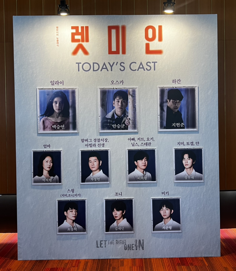 연극 <렛미인>은 욘 A. 린드크비스크의 소설이 원작이다. 이 소설은 스웨덴에서 처음 영화로 제작되었고 이후 미국에서 제작되어 인기를 모았다. 연극은 원작을 해치지 않으며 방대한 이야기를 적절히 무대화했다고 소설과 영화를 모두 본 친구가 말해줬다.