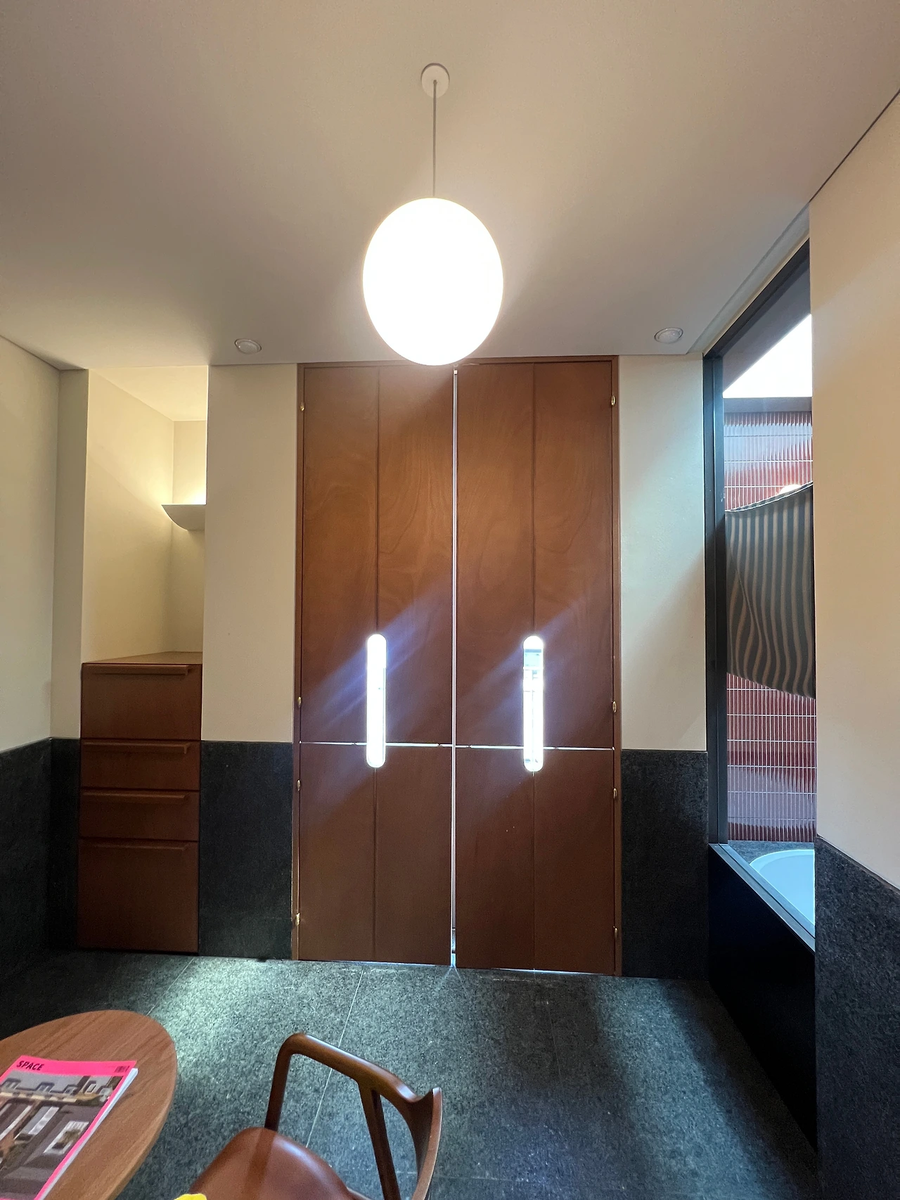 발코니로 나가는 문은 커튼 대신 나무 덧문을 달아 공간이 전체적으로 따듯하게 느껴졌다. 무엇보다 조도그 다소 낮은듯한 조명이 난 무척 마음에 들었다. 천정에 둥근달처럼 매달린 조명도 좋았지만 욕실과 화장실 벽 하단의 동전만 한 센서 등은 이용자를 위한 세심한 배려라 여겨졌다.