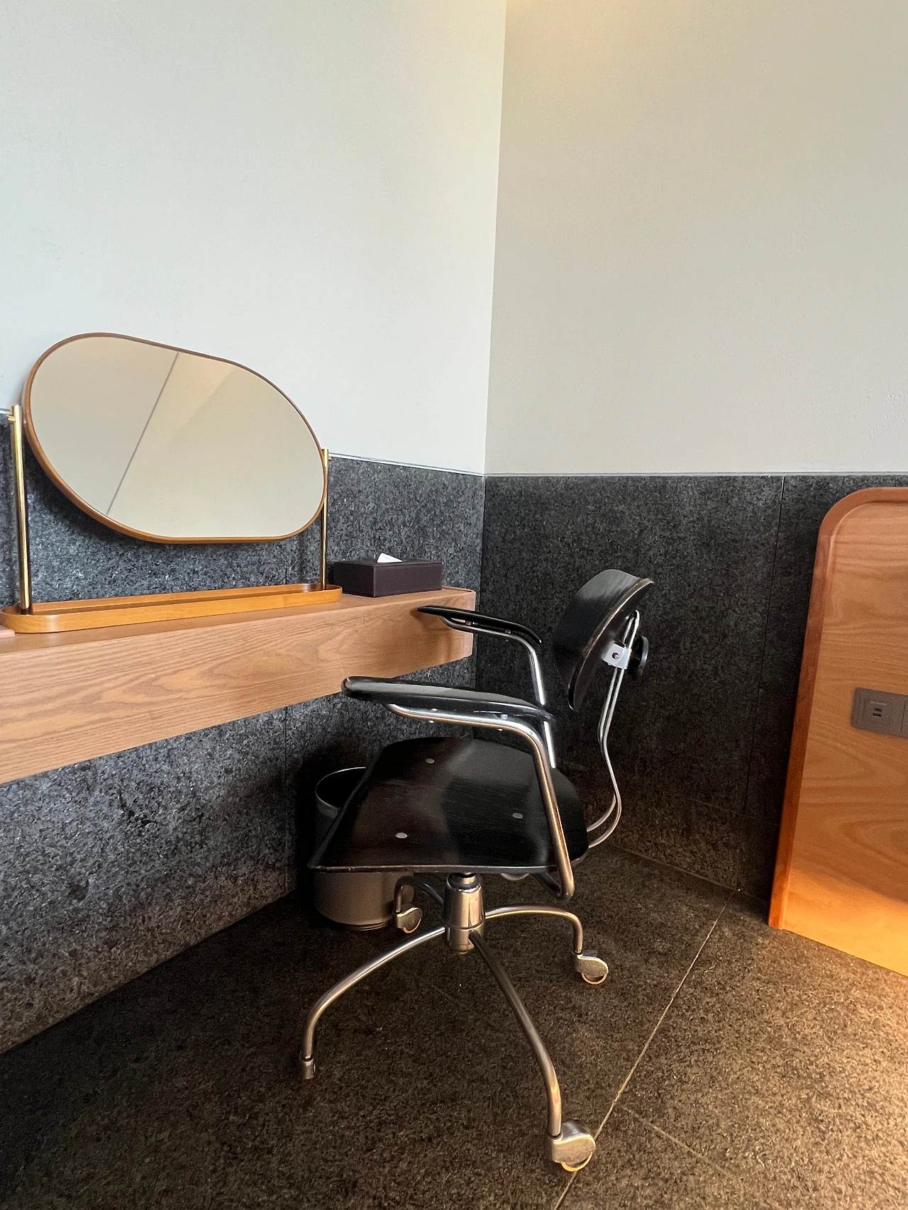 내가 사용한 객실은 3층의 트윈 룸이었다. 바닥과 벽 하단부 돌 마감은 온돌 시스템으로 맨발로 디디니 기분이 좋았다. 변기와 목욕실은 분리되었으며 큰 욕조에선 그대로 하늘을 볼 수 있도록 천정이 투명했다. 책상대신 작은 화장대와 낮은 테이블도 휴식에 맞춤했다. 내가 좋아하는 의자 에곤 아이어만의 와일드 스피어스가 화장대용 의자로 놓여있어 기분이 좋았다(공간 이곳저곳에 놓인 빈티지 의자를 발견하는 재미도 있다).
