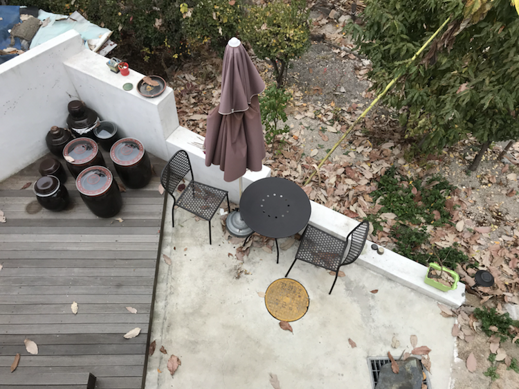 옥상에서 내려다 본 작은 마당, 데크의 장독에선 간장과 된장이 잘 익고 있다.