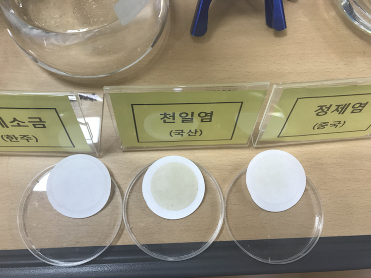 사진은 정제염인 한주소금과 국산 천일염 그리고 중국산 정제염을 증류 시킨 후 남은 부산물 혹은 부유물을 확인 한 것이다.