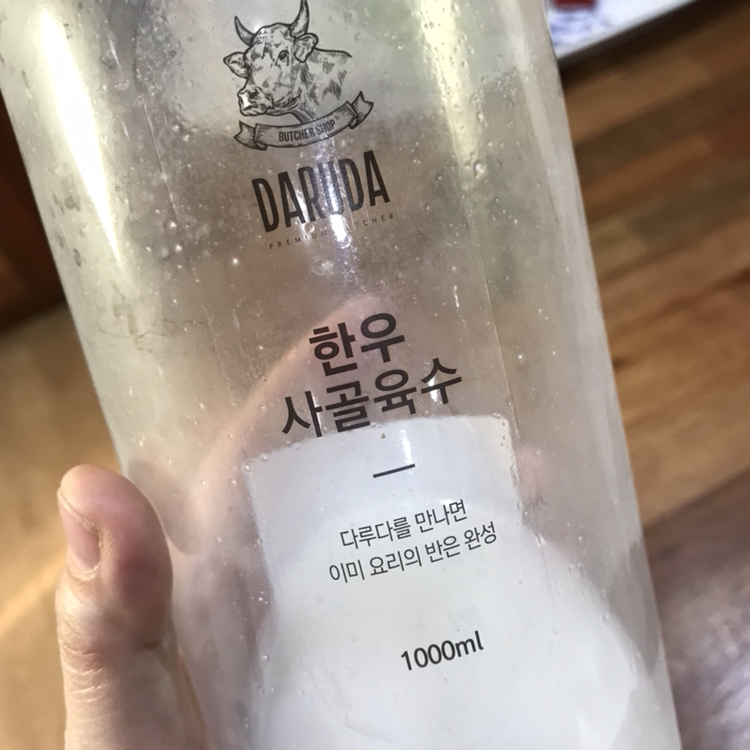 사골육수는 경기도 안성, 고삼농협의 것을 주로 사먹는다. 믿을만하게 생산되기 때문이다. 그런데 어젠 고양이 동물병원에 갔다가 청구역 근처 ‘다루다’라는 정갈한 정육점을 발견하고 1리터 7,000원 사골 육수를 구매했다.