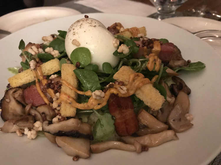 연어와 구운 굴이 깔끔한 성격의 초식남과 여성이 좋아할 맛이라면 터프한 남성은 물론 전 연령이 좋아할 맛은 바로 '수란과 볶은 버섯 샐러드'이다. 이 샐러드에는 구운 훈제 삼겹살이 숨어있다. 샐러드로는 먹으며 든든한 기분까지 들게하여 식사 대용으로도 손색이 없다. '브리 치즈 튀김과 샐러드'역시 좋다. 튀긴 치즈라니? 나는 치즈를 튀긴다는 상상을 해보지 못했다. 겉은 바삭하고 속은 부드럽고 촉촉한 브리 치즈의 느낌이 그대로 살아있다. 화이트 와인과 같이 먹으면 그만이다.
