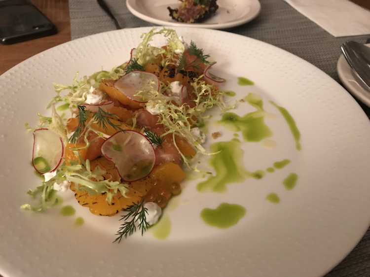 이어진 '염장한 연어와 귤'. 이 음식은 연어가 아닌 귤이 주인공이었다. 잘 구워진 귤은 부드러웠고 더 달콤했다. 연어 위에 귤을 얹어 먹으니 색의 조화만큼 맛의 조합도 좋았다. 상큼함과 고소함이 입맛을 깨웠다. 귤을 구워먹어 본 사람은 구운 귤이 얼마나 달콤하고 동시에 부드러우며 향이 좋은지 모른다. 이 곳의 귤은 구운 후 하룻동안 그 상태를 유지해 귤의 과즙에 귤 껍질의 향이 베도록 한단다. 그리고 서브하기 직전에 귤의 껍질을 깐 후 구운 귤의 느낌을 살리기 위해 토치로 그을린다고 한다.