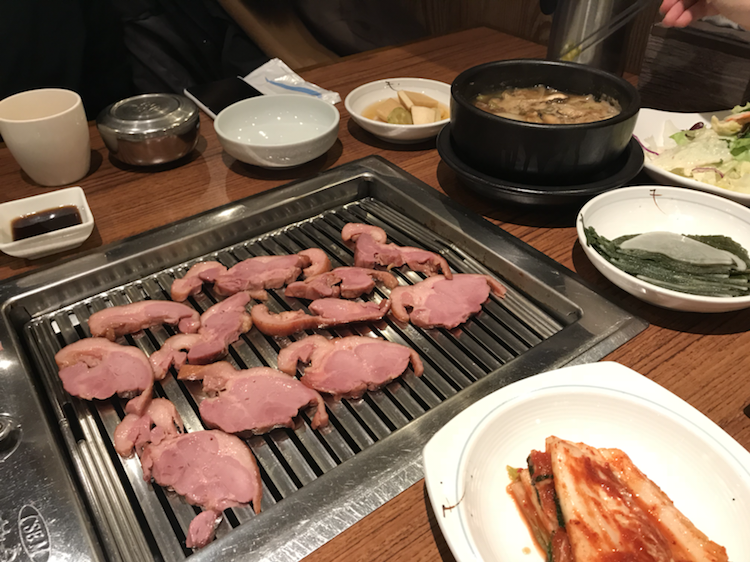 점심 /오리고기 100그램 정도. 밥 반그릇, 깻잎과 무 초절임