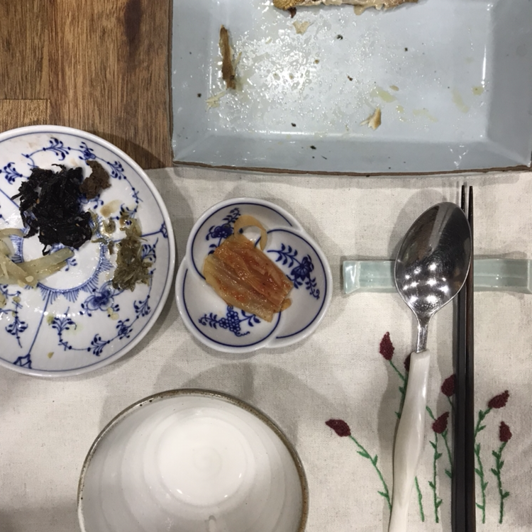 고등어를 굽고, 옆집에서 주신 찬으로 상을 차렸습니다. 저희 집엔 저렇게 다양한 밑반찬이 없을 뿐더러 만들지도 않습니다. 밑반찬도 좀 챙겨야 하는데 만들어 두면 버리기 일쑤여서 준비하지 않은지 한참되고, 잘 만들지도 못합니다.