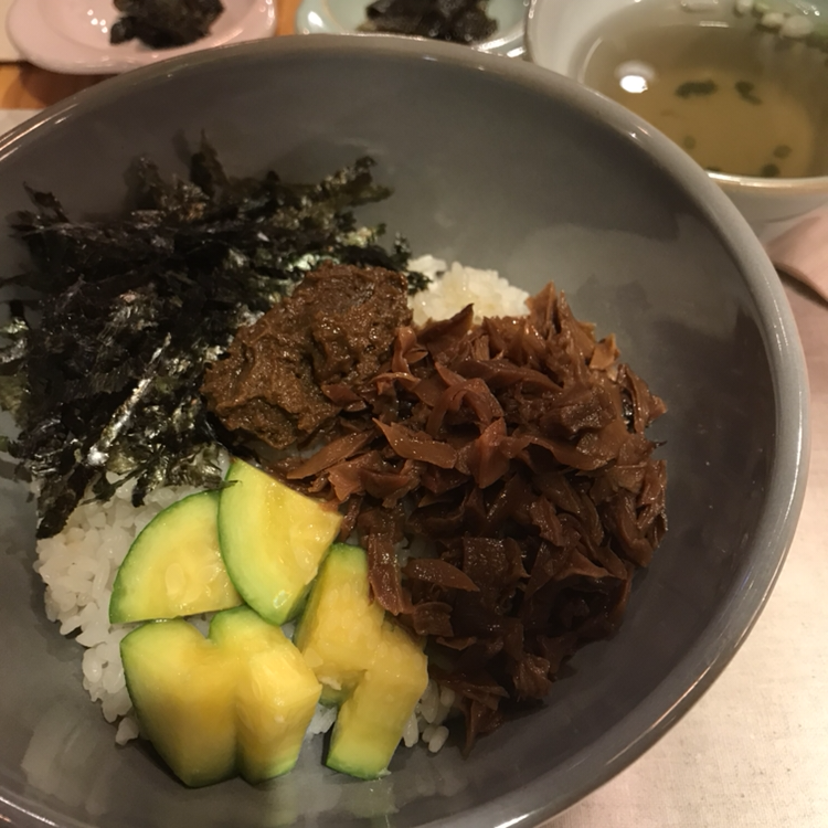 볶은버섯, 두부, 조미가 안된김이 고명으로 오르고 국물은 채수다. 얼마나 국물을 정성스럽게 내렸는지 고깃국물 못지 않다.