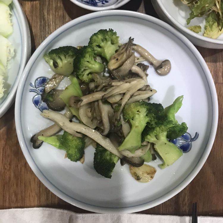질좋은 올리브 오일에 마늘 넣고 볶다 뜨거운 물에 담가 살짝 익힌 브로컬리, 느타리 버섯을 넣고 볶는다. 후추만 뿌려 마무리 한다.