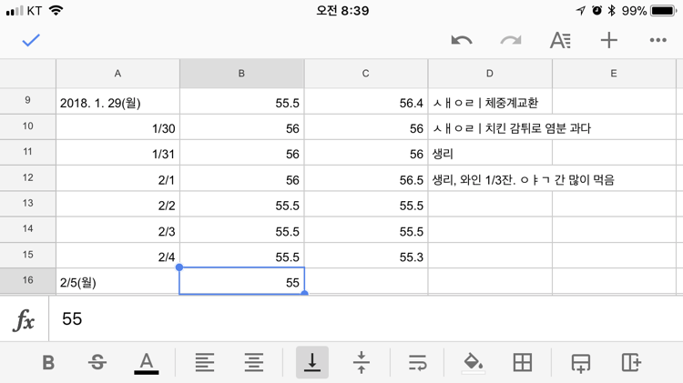 1/29일 체중계를 기존에 사용하던 타니타(9년 사용)에서 샤오미체중계2로 바꿨다. 교체한 체중계는 대략 500그램 쯤 더 높게 나오는 것으로 비교되었다. 따라서 월요일 아침 시작시기 체중은 56으로 보아야 변화가 조금 더 정확할 거 같다. 지난 한 주 나는 대략 700그램의 체중을 감소시켰다.