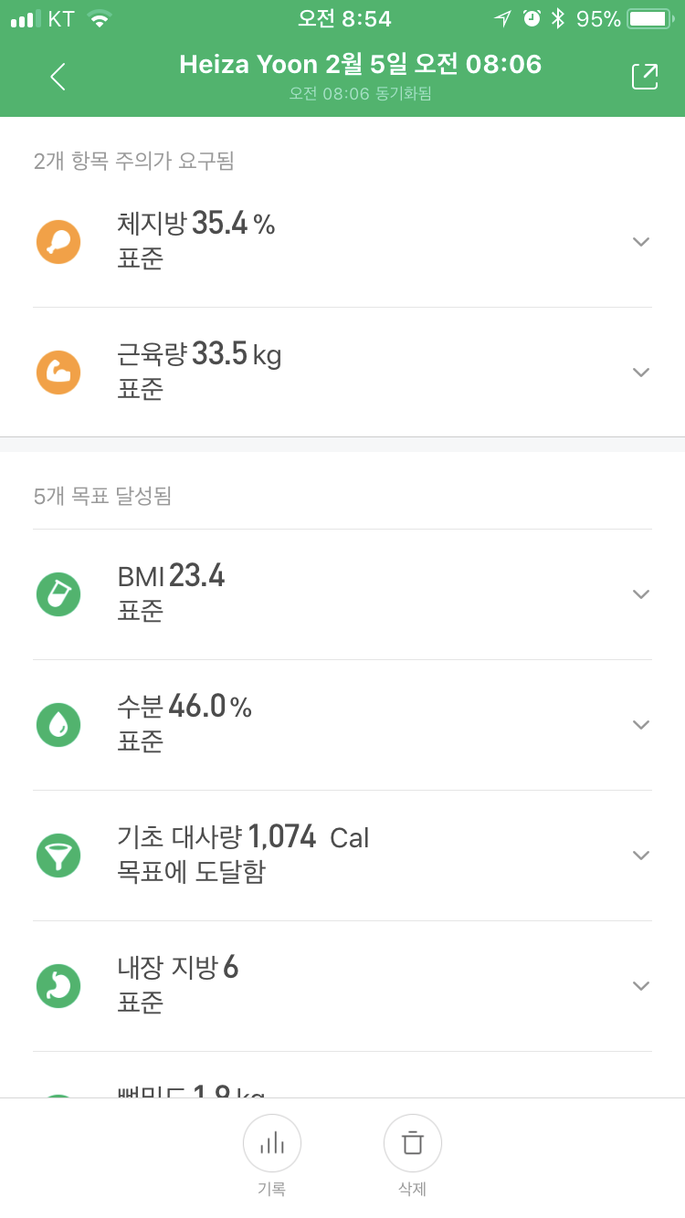 휴대폰에 mi-fit 앱을 다운받아 이 앱을 실행시키고 체중계에 올라서면 내 몸의 지수들이 그대로 mi-fit에 기록된다(휴대폰 블루투스는 온 상태).