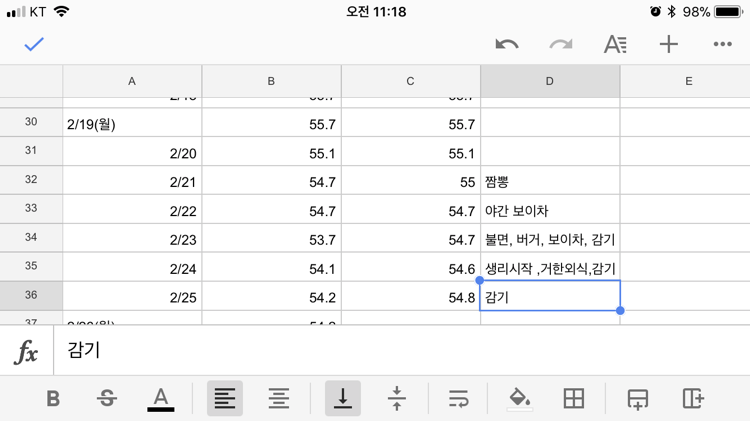 체중이 55키로 대에서 움직이지 않더니 5주차주엔 조금 내렸다. 다행이다.