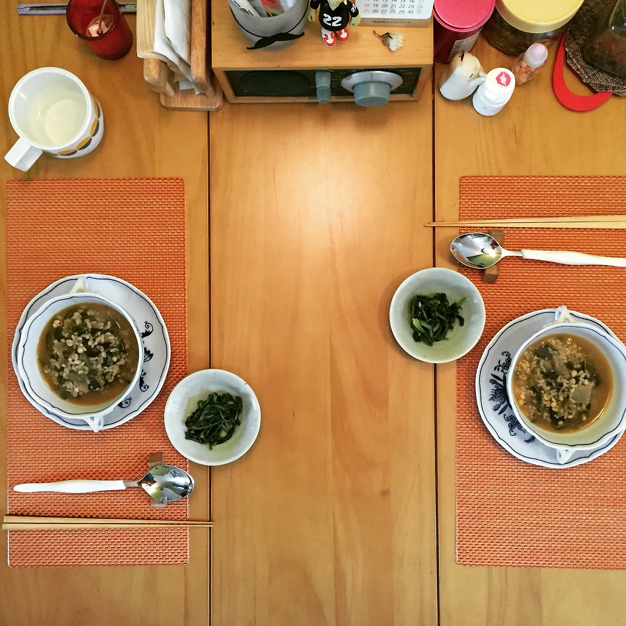 오늘은 된장국의 채소 건더기를 건져 현미밥에 넣어 죽을 끓였습니다. 남편에겐 전날 저녁 충분히 동의를 구했지요. 남편도 잘먹고 전 속이 편해서 좋습니다.