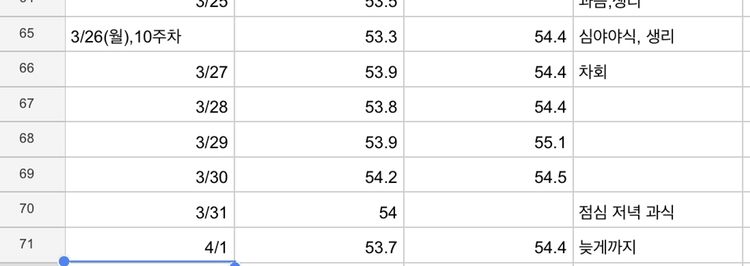 아래는 체중표이다. 엄청난 날도 하루 있다. 4월엔 51키로대에 안착하고 싶습니다.