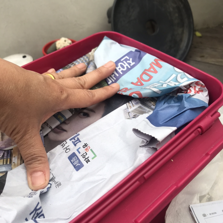 그리고 마늘을 넣고 그 위에 다시 신문지를 덮는다 이렇게 마늘과 신문지를 층층이 넣고 맨 위도 신문지로 덮는다.