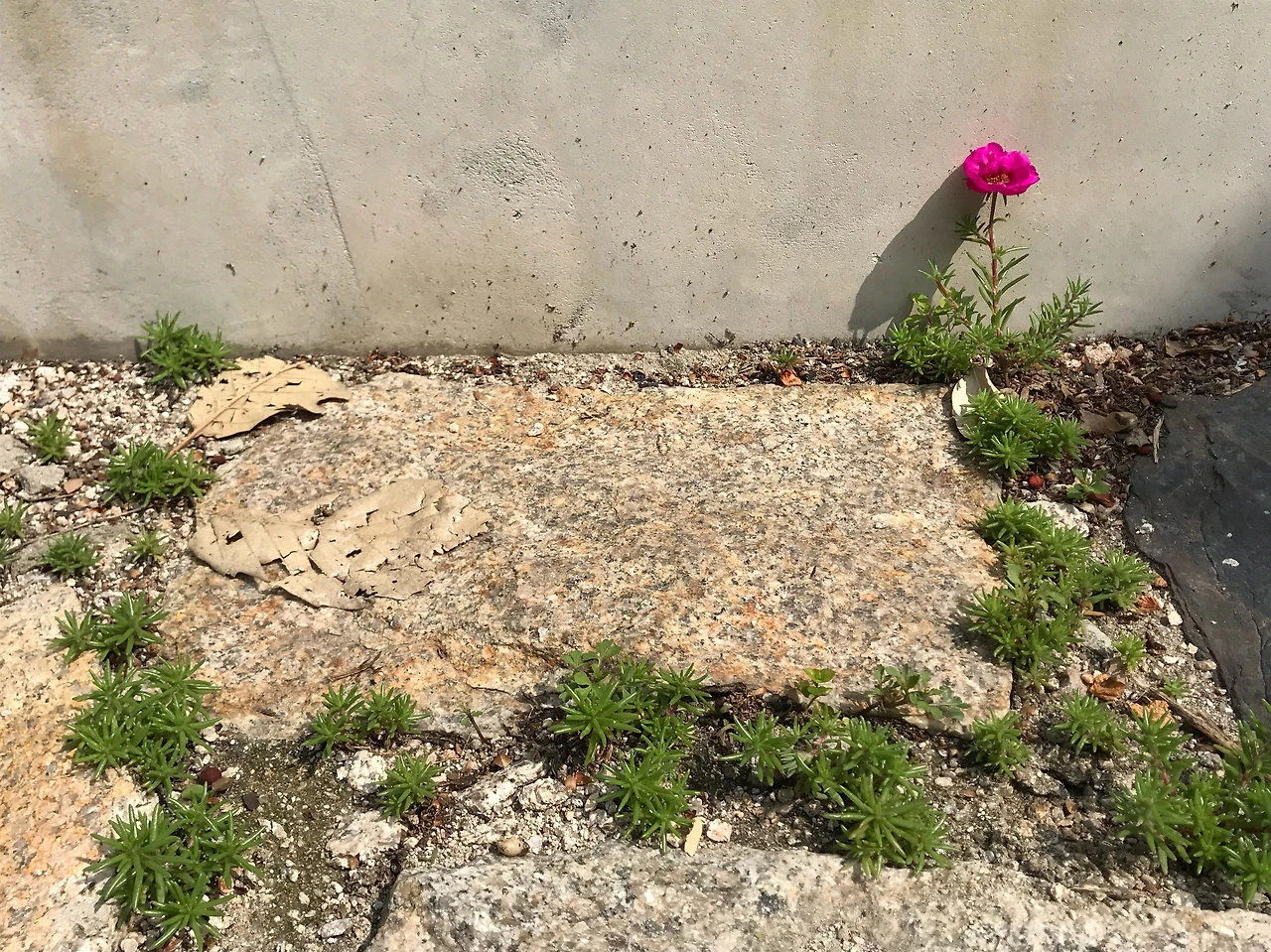 그런데 세 해째인 올해는 화단에 채송화가 보이지 않았다. 대신 화단 아래 마당 돌틈 사이에서 얼굴을 내밀더니 이렇게 수줍게 꽃을 피웠다.