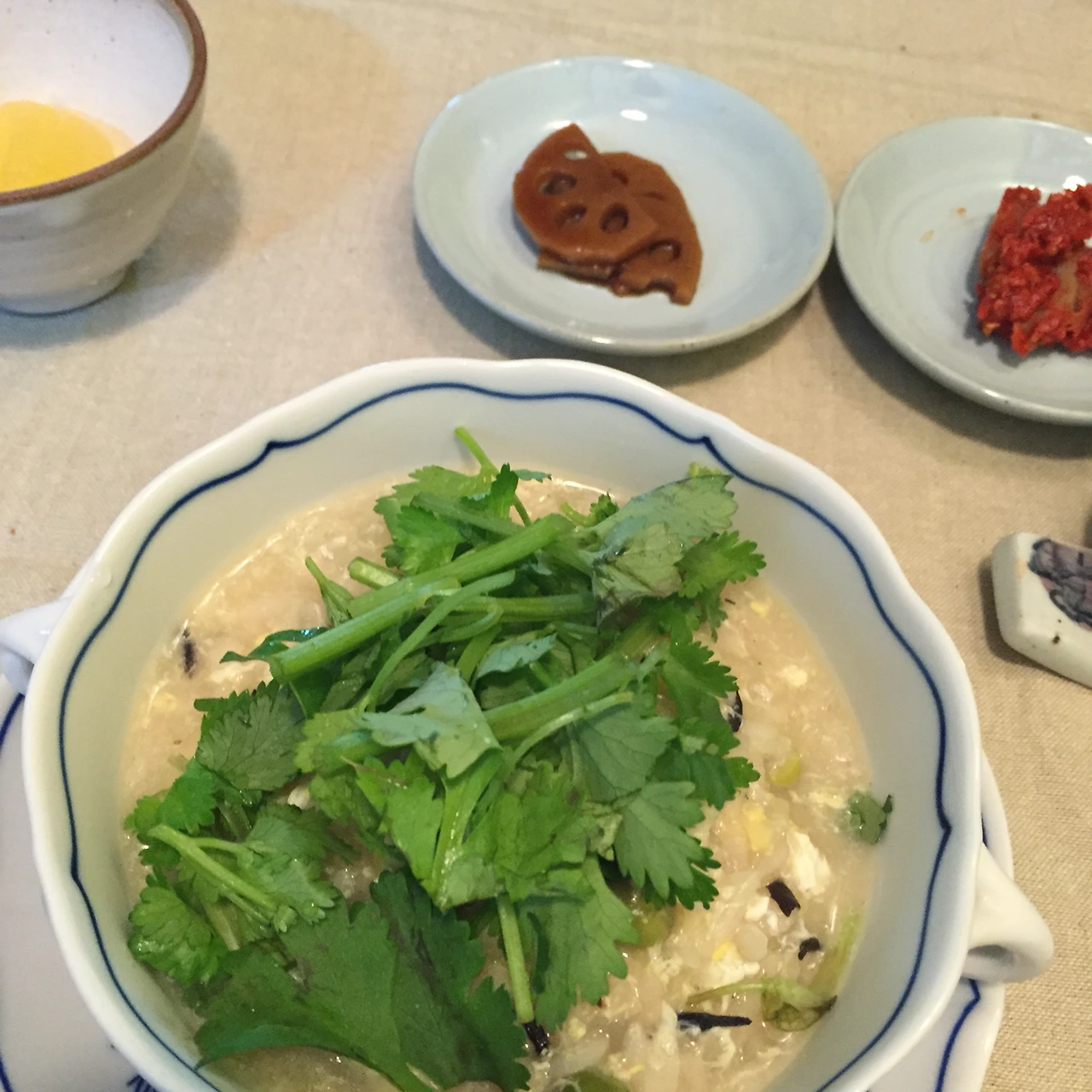 양파, 무, 양배추를 넣고 볶다 밥을 넣고 끓입니다. 계란을 한 개 풀어서 넣고 계란이 익으면 집간장과 소금으로 간하고 그릇에 담아 고수를 얹고 내었습니다.