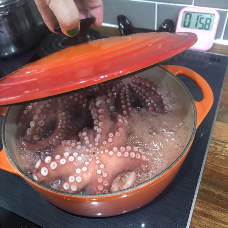 시간을 12분에 맞추고 뚜껑을 덮고 처음에 중간보다 조금 센불로 조리를 시작한다. 문어가 부르르르 끓어오르면 불을 중간보다 살짝 약하게 유지한다.