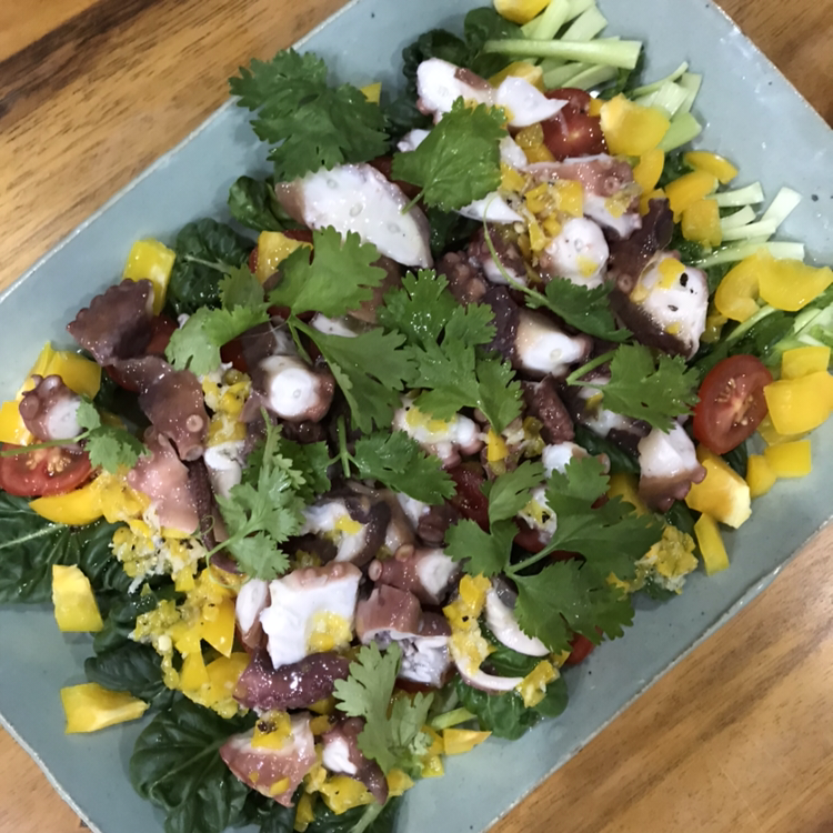 플래이팅할 땐 채소를 한 겹 깔고 문어를 올리고, 색이 이쁜 채소를 문어 위에 살짝 올려준다. 플래이팅할 땐 깊은 접시보다 넓은 접시를 사용한다^^