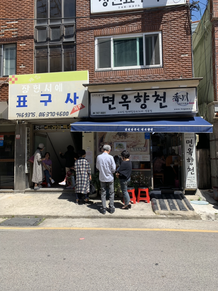 오늘의 주요 일정은 면옥향천의 메밀 국수 먹기. 줄 서기가 무서워 1시가 지나 해운대에서 출발했다. 도착하니 1시 45분. 그런데도 대기가 있었다. 기다리는 동안 난 메밀 100프로 순메밀 모리소바와 유부초밥을 남편은 비빔메밀국수와 돈가스를 주문했다. 우리 앞으론 수다스러운 아주머니들 몇 팀과 나이 든 커플 몇 팀이 있었다. 내 앞에서 아주머니가 욕심내어 유부초밥을 주문하시더니 내 차례에 남은 유부초밥은 딱 한 개였다. 아쉬운 대로 한 개를 주문했다. 그나마 다행 아닌가.