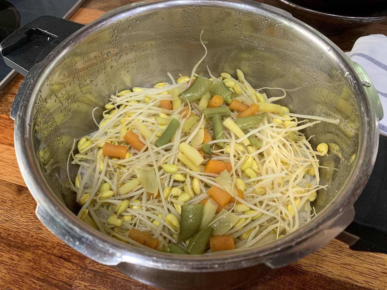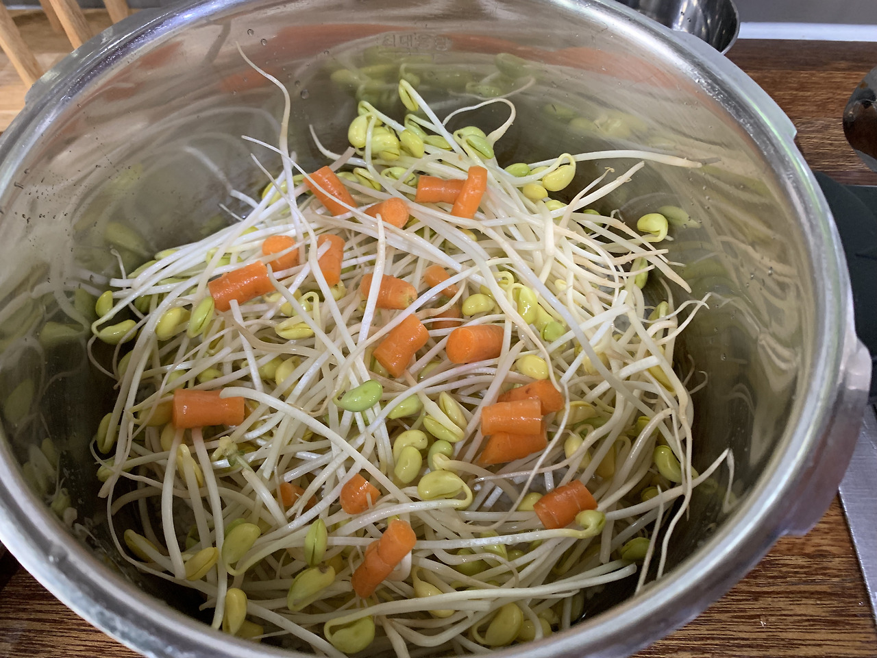 잘 불린 쌀을 솥에 넣고 그 위에 콩나물을 얹는다 혹시 집에 당근과 같은 단단한 채소가 있으면 같이 넣어도 된다.