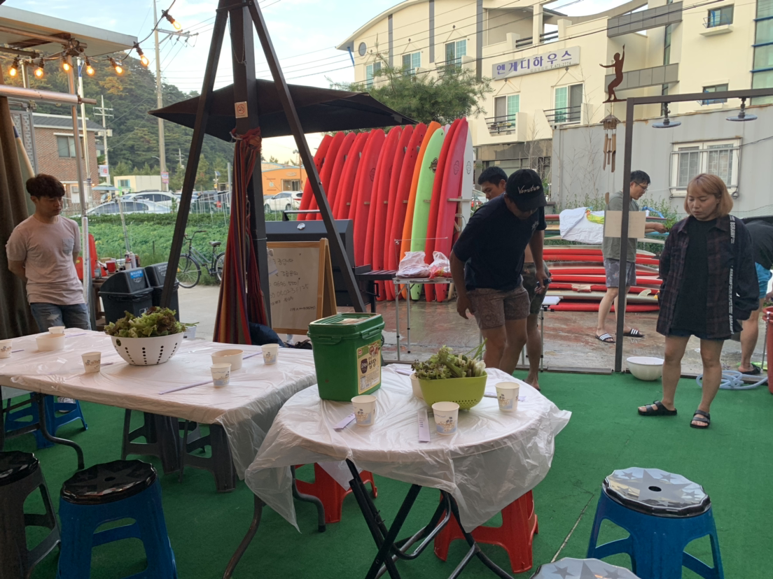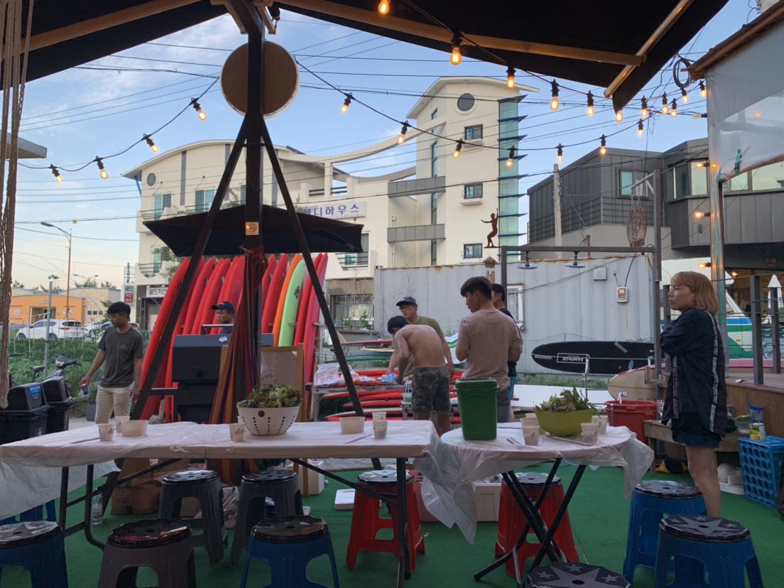 첫날 서핑을 마치고 저녁은 '엉클서프'에서 열린 바비큐 파티에서 고기를 맘껏 먹었다. 엉클서프는 매주 토요일 저녁에는 이렇게 바비큐 파티를 열어 자연스럽게 서퍼들이 모일 수 있도록 한다. 예약을 하고 2만 원만 내면 이 자리 어울릴 수 있었다. 이 자리에서 만난 2030 젊은 서퍼들의 표정은 하나같이 밝고 행복해 보였다.