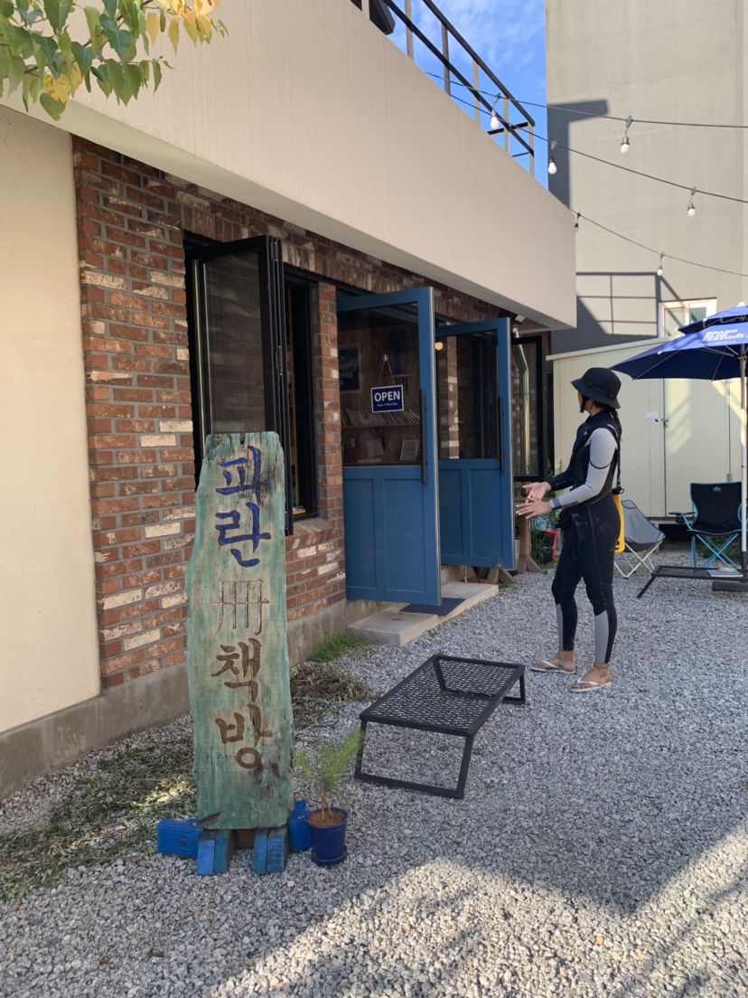 책을 좋아하고 책은 만드는 우리는 동네에 책방이 있으면 가급적 찾아간다. 양양에도 작은 동네 책방이 있었다. 책방 이름은 <파란 책방>. '그대 안의 블루'라는 영화로 한국 영화계의 미적 감각은 한 단계 올린 이현승 영화감독이 운영하는 곳이다. 이현승 감독은 2013년 서핑에 입문하고 서핑과 사랑에 빠져 결국 양양에 터를 잡았다고 했다. 파란 책방은 무인 운영이다. 책을 읽고 싶으면 들러서 책을 읽고 진열된 책 중 필요한 책이 있으면 구매를 하면 된다. 책 값은 책방 내 돈통에 집어넣으면 된다. 우리도 당연히 책을 구매했다.
