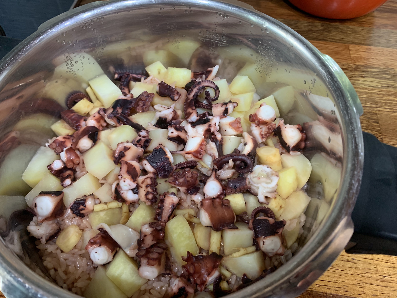3> 쌀위에 데친 문어와 깍둑 썬 감자를 얹는다.