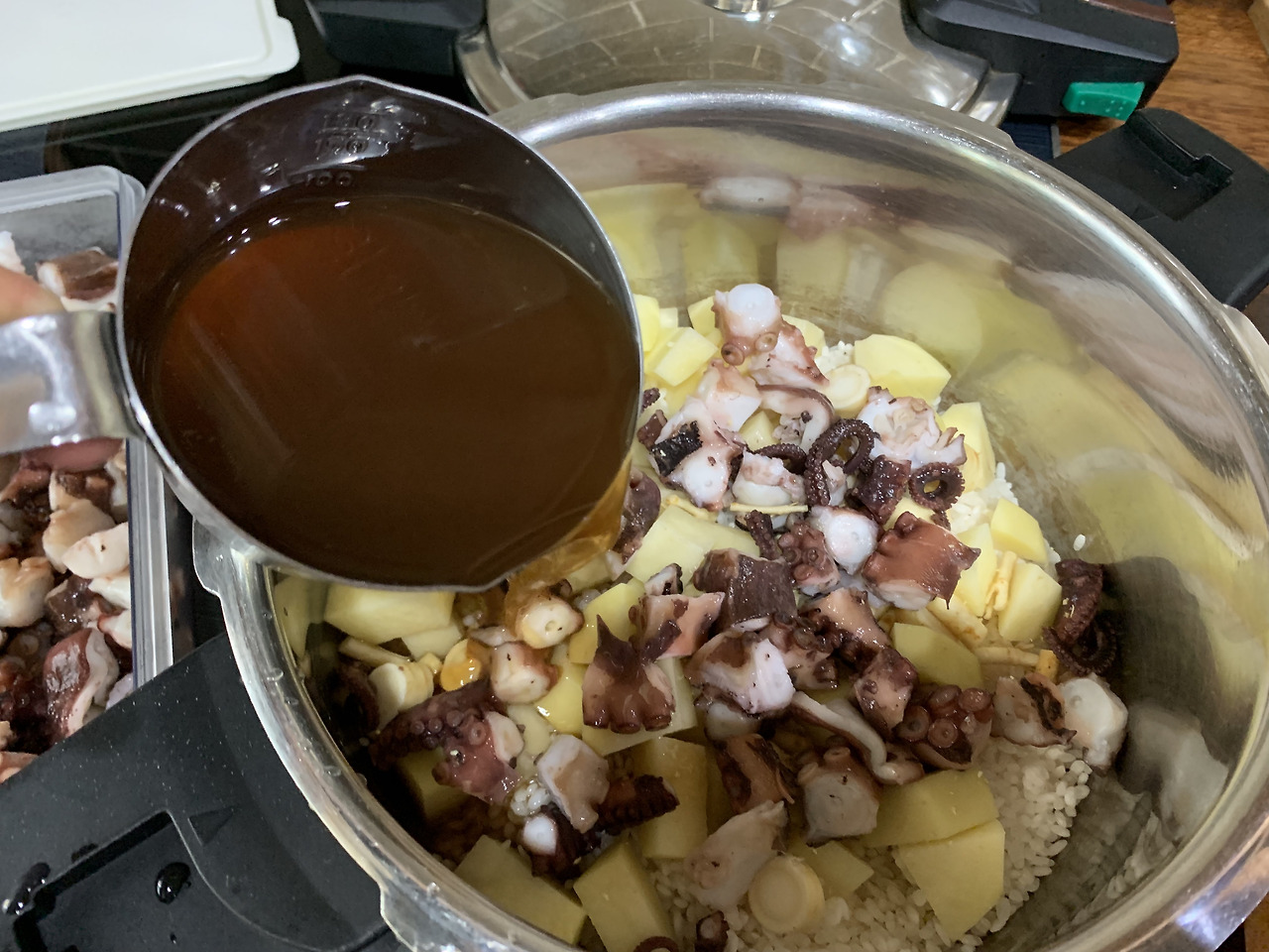 문어를 데치고 그 데친 물로 밥물을 잡으면 밥 색도 이쁘고 밥 맛도 더 깊어진다.