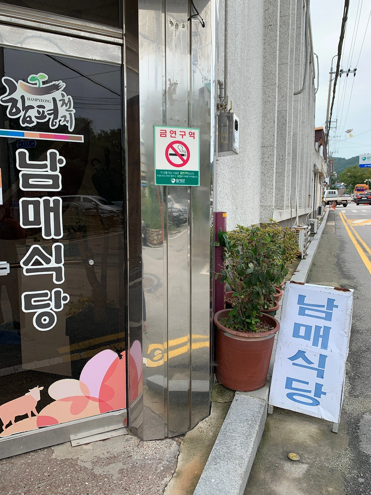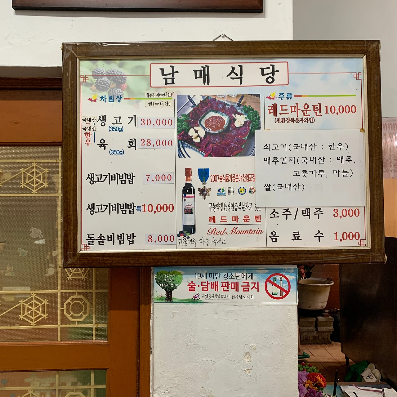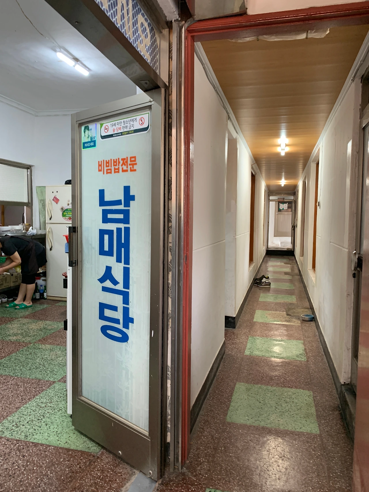 <남매식당>은 함평군청 인근이었다. 군청 앞에 적당히 주차를 하고 음식점으로 들어갔다. '비빔밥 전문' 이라는 안내도 좋았지만 시간을 그대로 담은 낡은 간판도 좋았다. 입구에 들어서니 손님을 응대하는 계산대가 있고 홀은 긴 복도에 마주본 작은 방이 대신했다. (이 건물은 오래 전에는 여관이 아니었을까하는 생각을 잠시 했다)