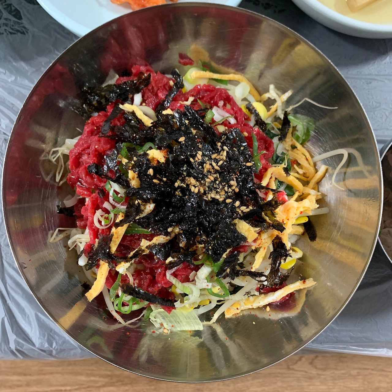 드디어 비빔밥, 생고기와 채소가 적당히 얹어진 육회 비빔밥이다. 고기 빛깔도 좋다. 밥을 비비기 전에 간을 볼 겸 고추장을 살짝 찍어 먹었다. 순간!!!!!! "와 이 집은 진짜다!"라는 생각이 들었다.