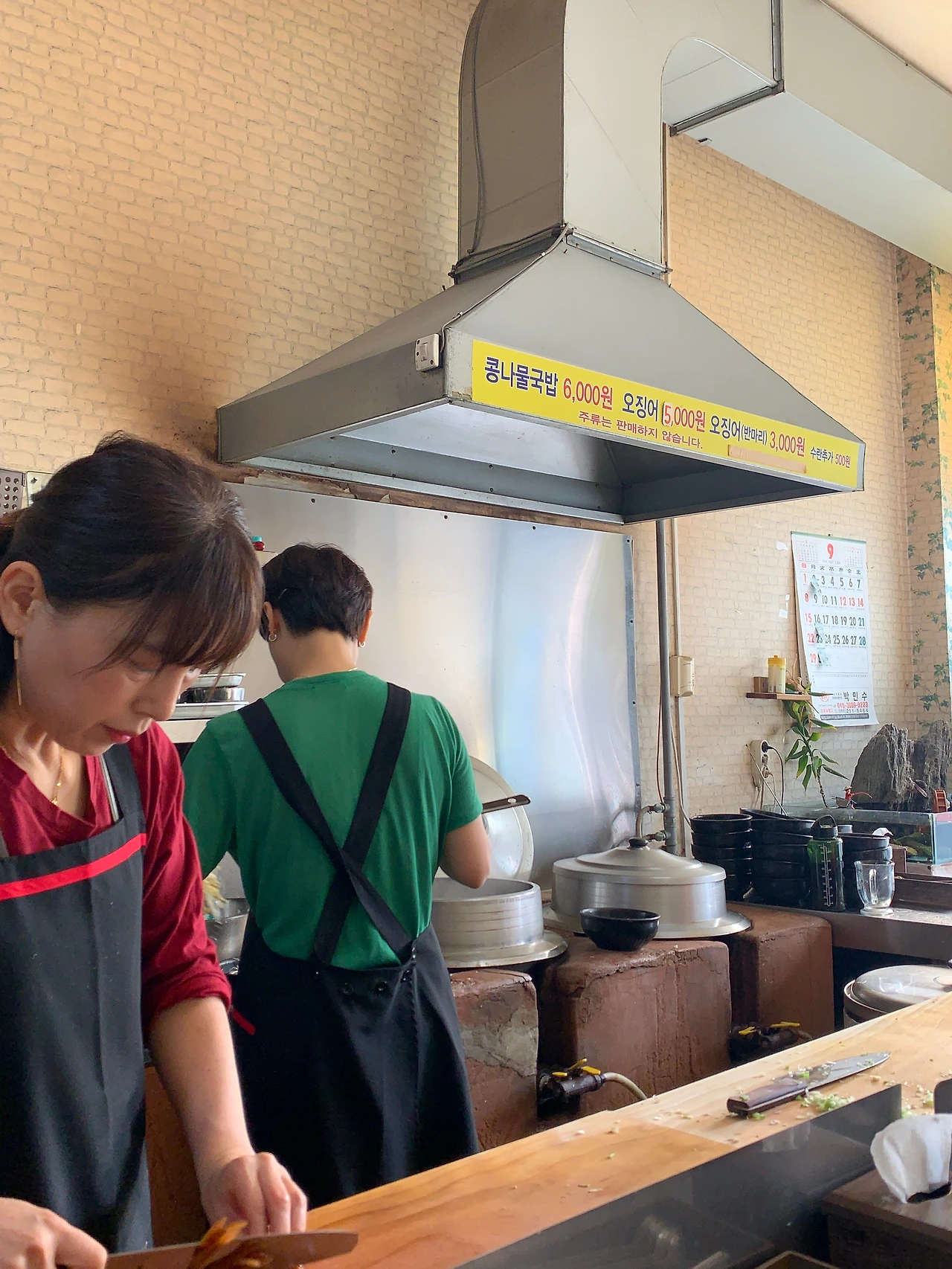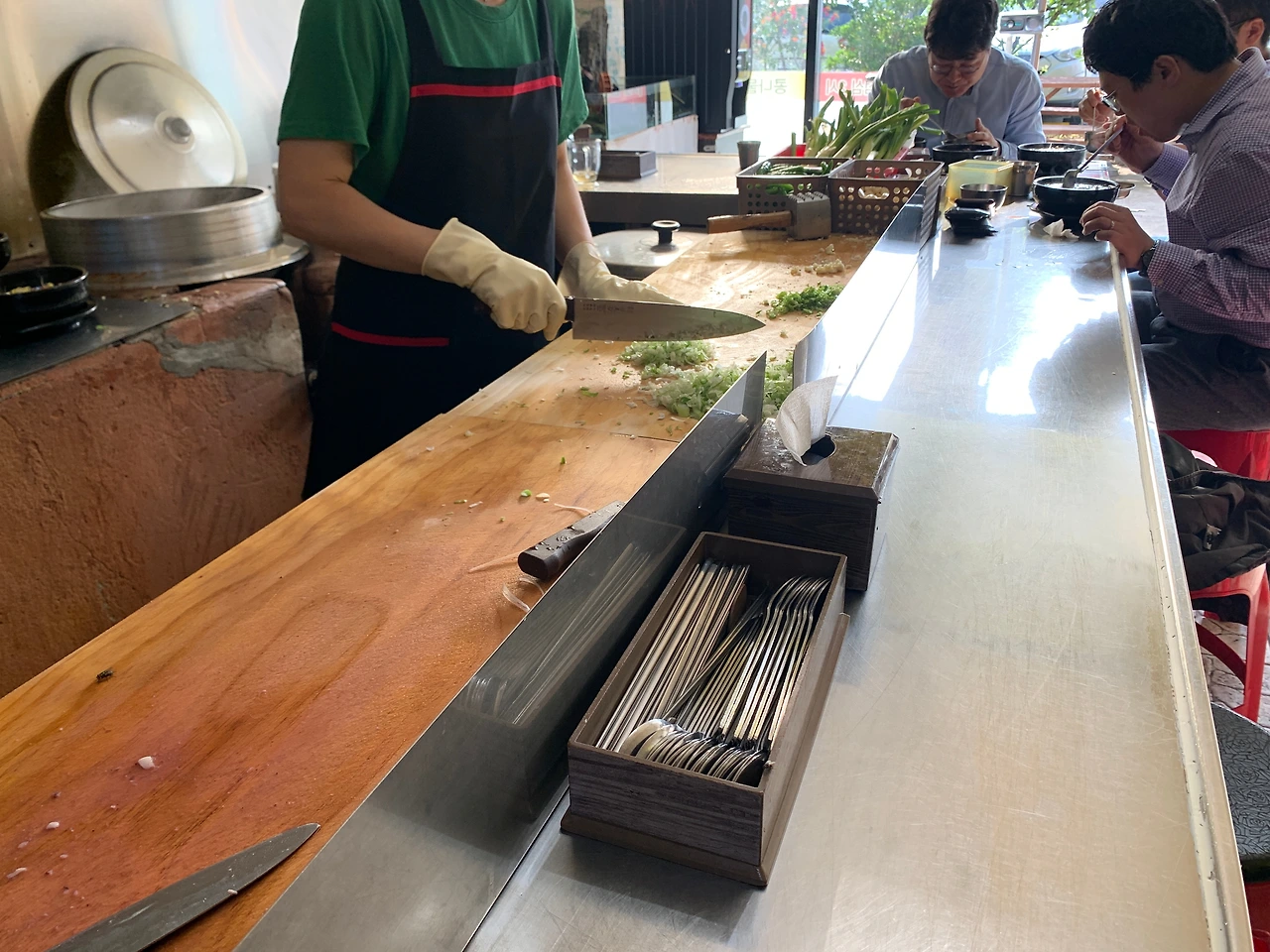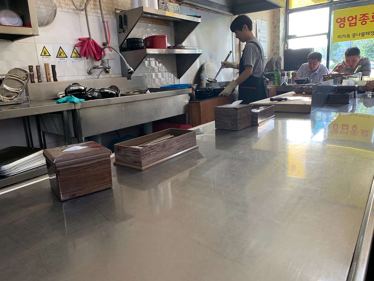 주방을 향한 일자형 테이블로 주방과 손님상의 간격이 좁다.