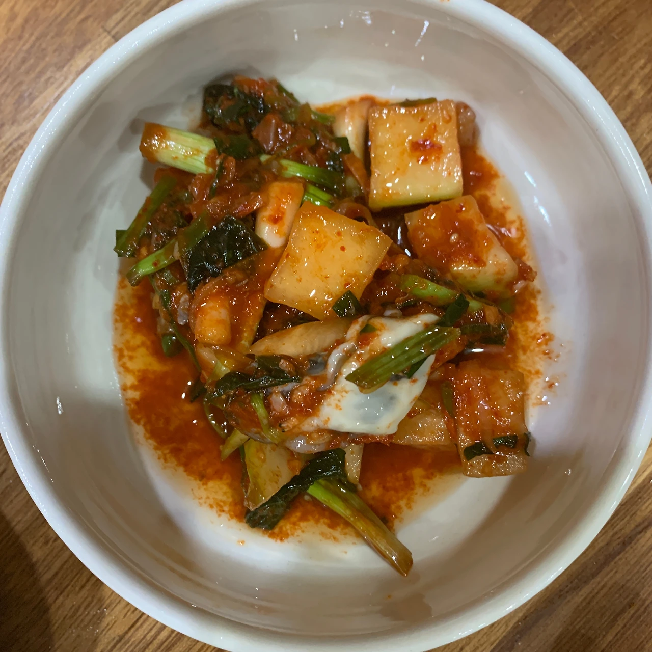 김치 양념을 먼저 섞고, 무를 양념에 버무린 후 마지막에 굴을 넣어 살살 버무려 완성한다.
