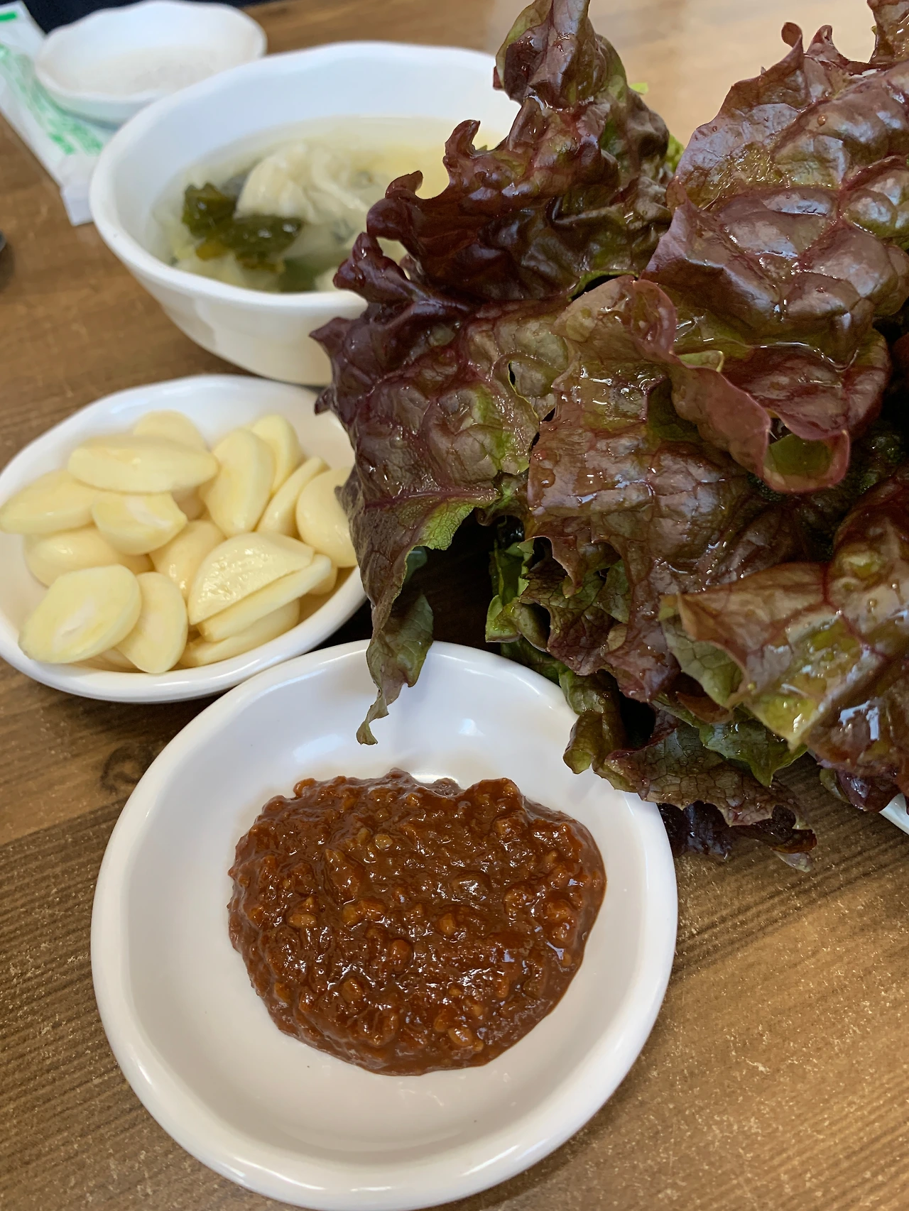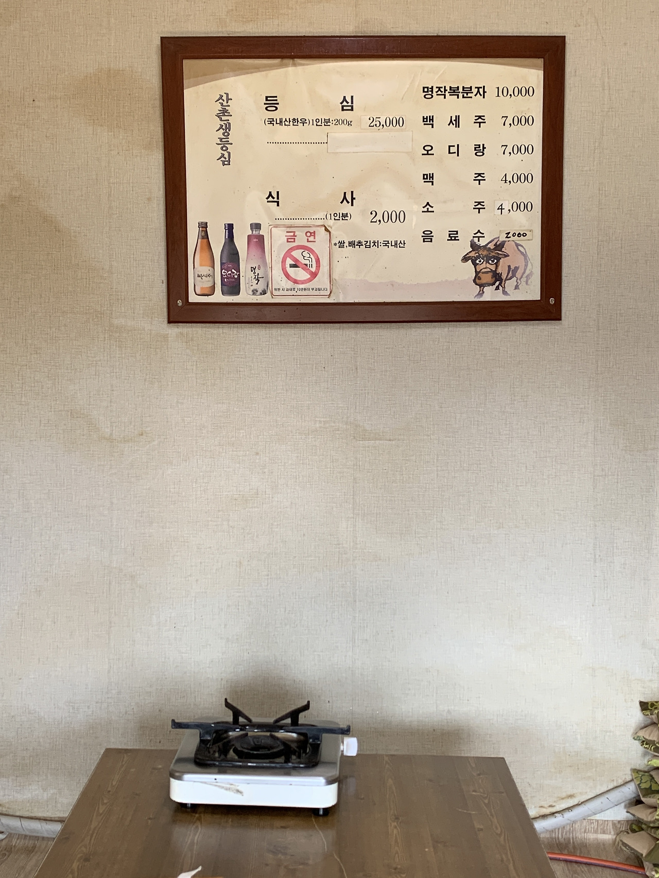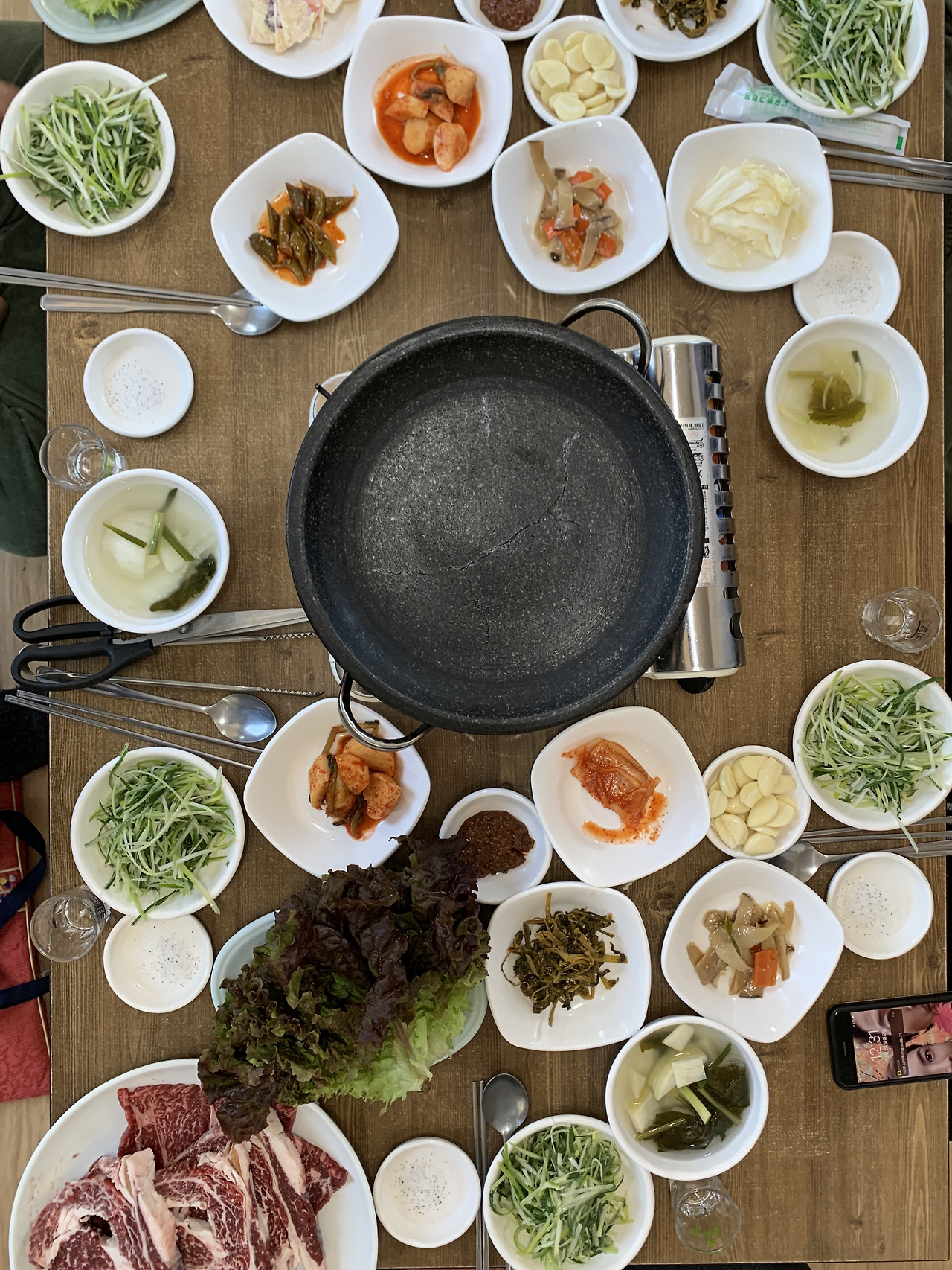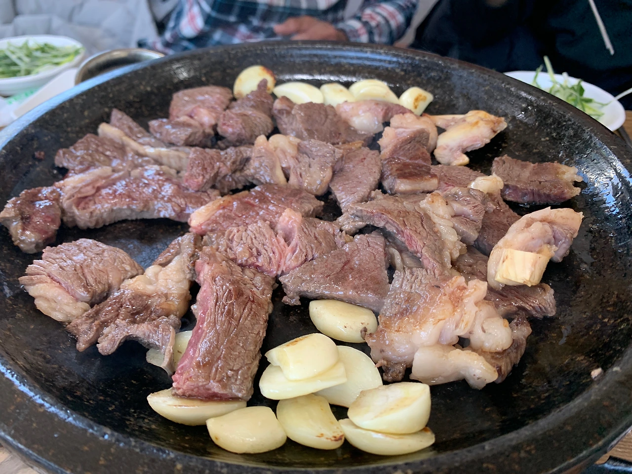 드디어 고기가 나왔다. 1인분 200그램에 2만 5천 원. 한우다. 서울의 가격과 비교할 수 없이 저렴한데 그 맛도 훌륭했다. 살짝 익히니 부드러운데 동시에 씹는 맛도 좋았다. 정량보다 많이 주셨는지 성인 다섯이 오 인분을 채 다 먹지도 못하고 배부르단 말을 연발했다.
