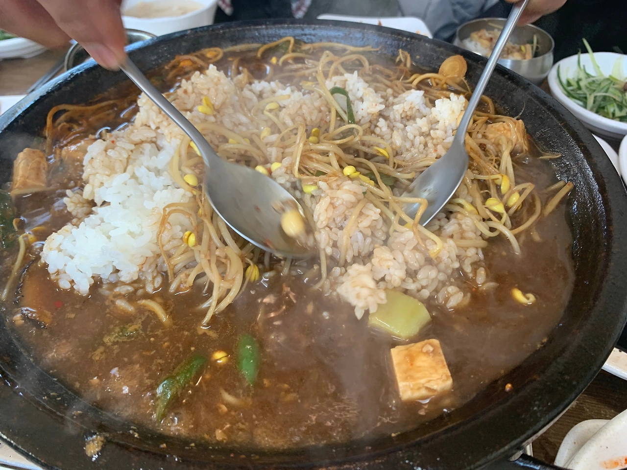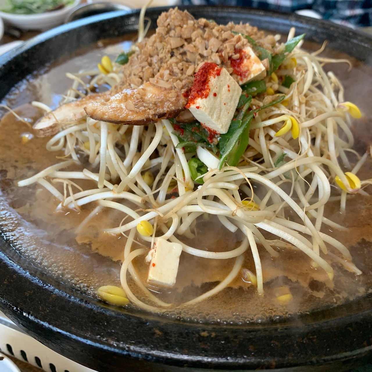 식사를 주문하면 집에서 길렀을 것이 확실한 콩나물이 듬뿍 든 된장찌개를 고기 굽던 돌 냄비에 준비해 준다.