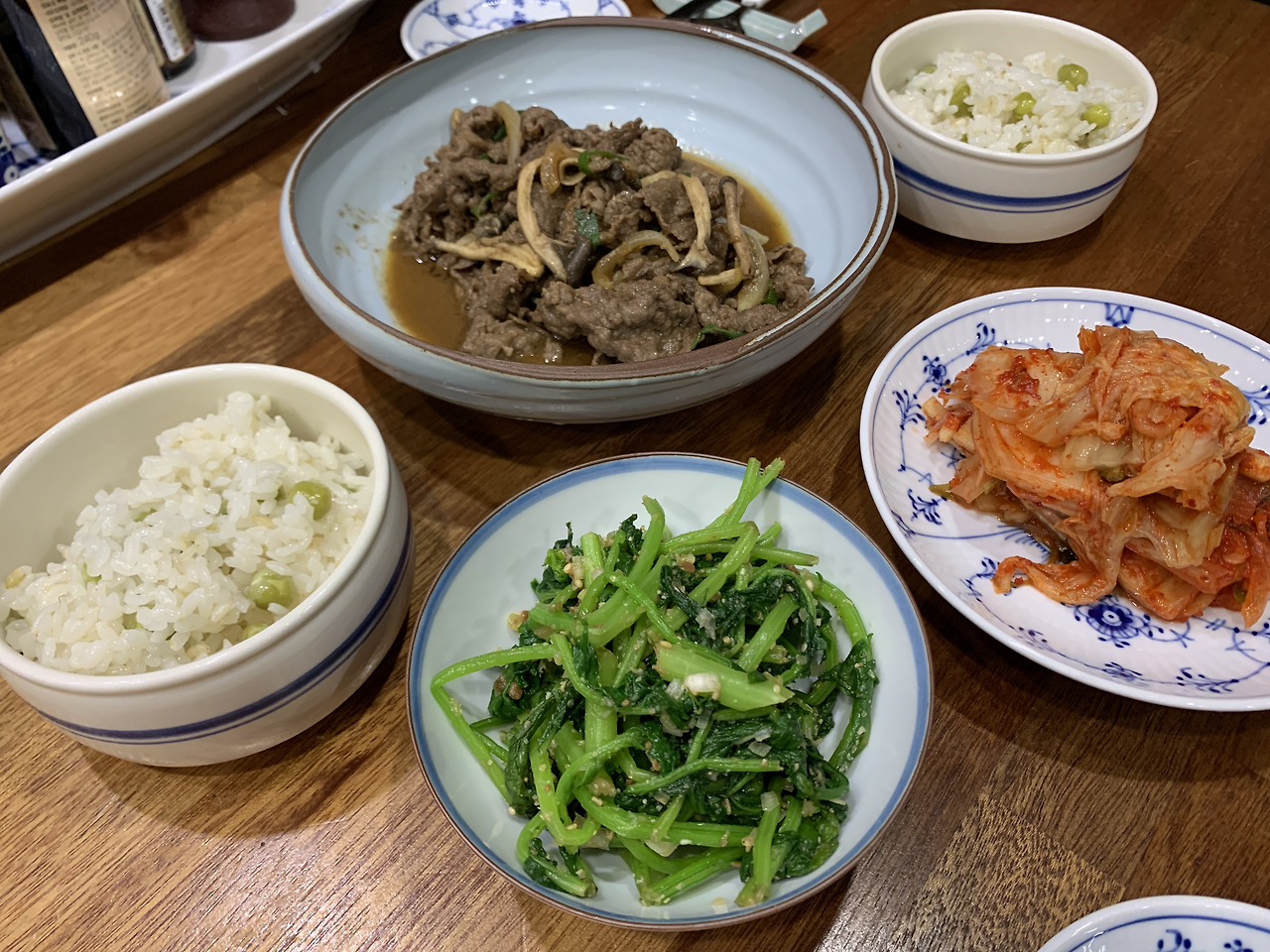 2019년 마지막 끼니까지 외식을 하지 않으려 간단히 밥을 지었습니다. 소고기 400그램을 사서 불고기를 하고 유채나물을 사서 된장에 무치고 냉동실에 있던 완두콩을 넣어 밥을 지었습니다.