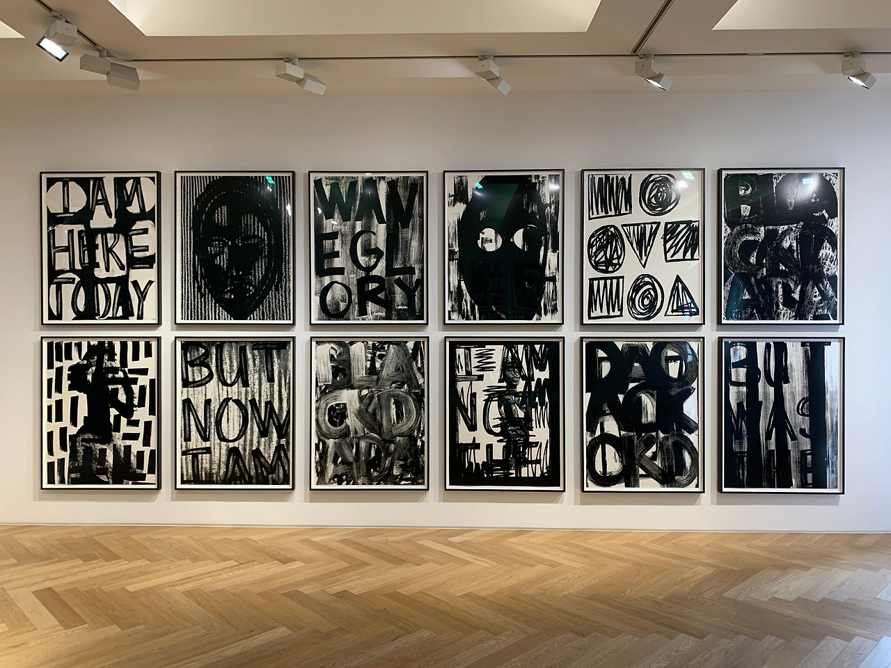**페인팅이라 표현혔디만 실제로는 투명 아크릴에 실크스크린이니 판화라 말하는 게 맞는 거 같다. 반복되는 문자에 그림을 입힌 형식이다