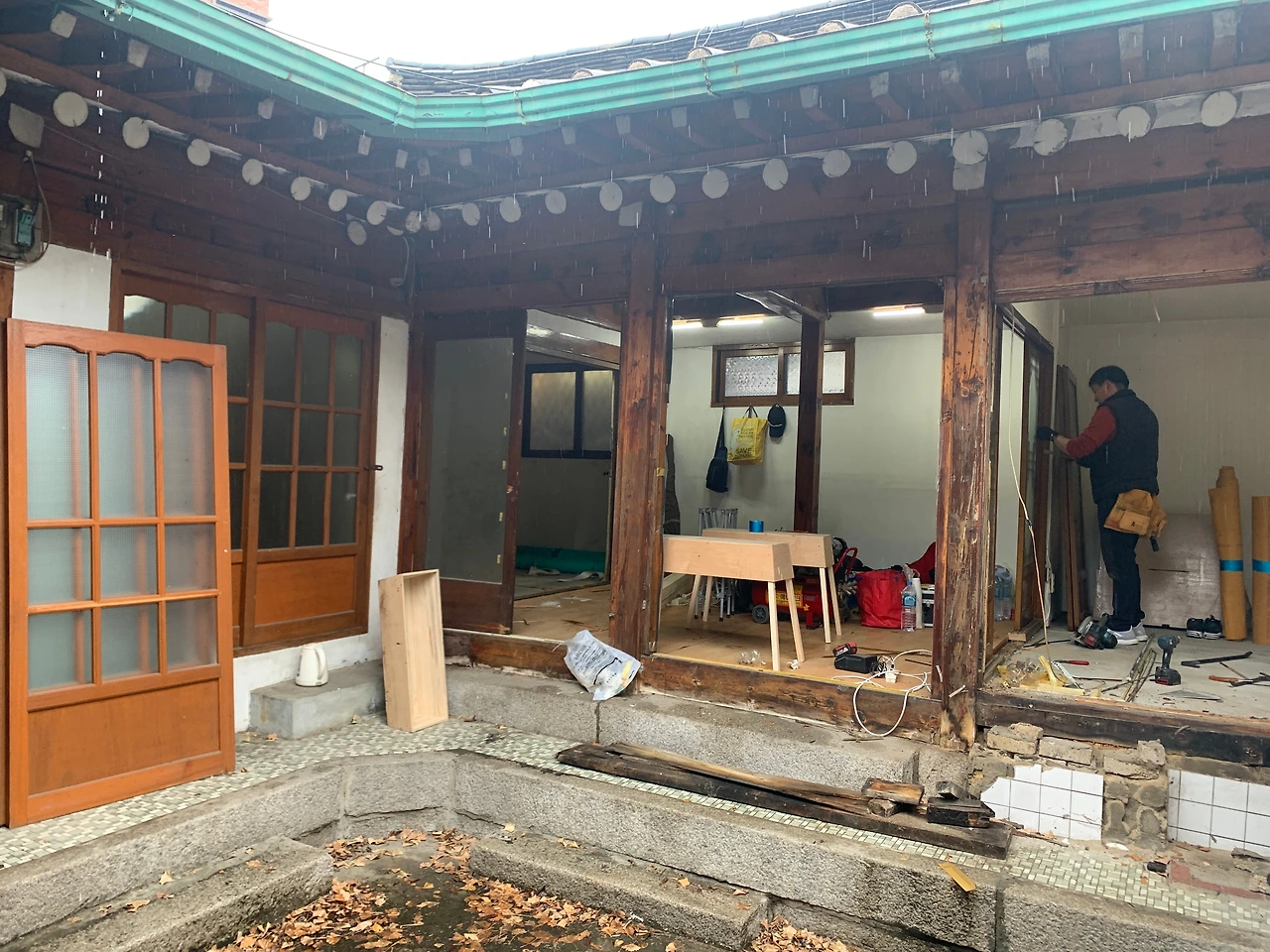 공사 시작 첫 날, 비가 내려 현장에서 일을 진행하실 목수님 세 분만이 집의 상태를 진단하기 위해 해체를 시작하셨다