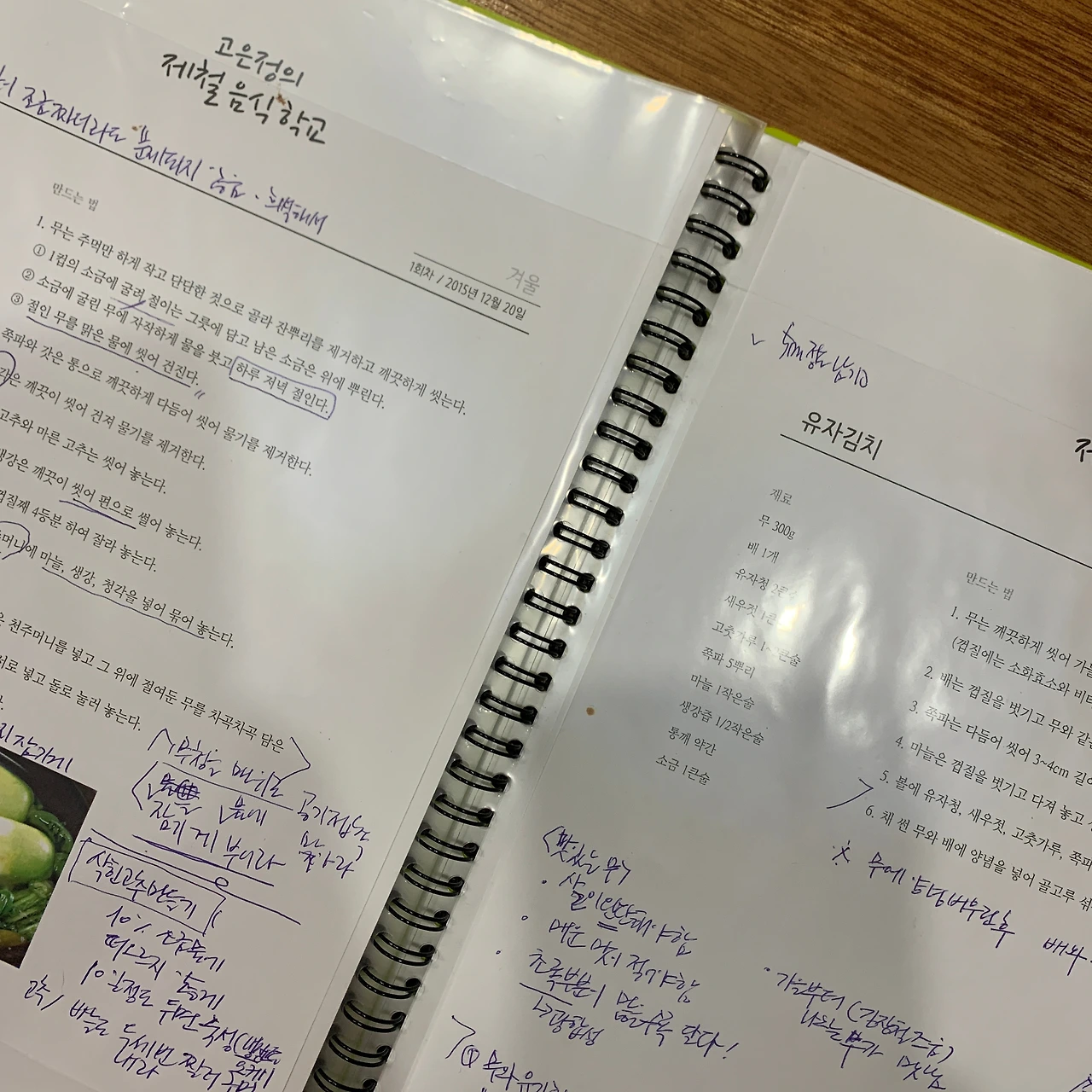 내 모든 김치는 조리법은 단순하지만 맛은 보장되는 고은정 선생님의 레시피를 따른 것이다. 1년 동안 지리산을 오가며 배웠고 수업에서 받은 레시피 중 김치만 따로 분리해 김치 레시피책으로 만들어 사용 중이다