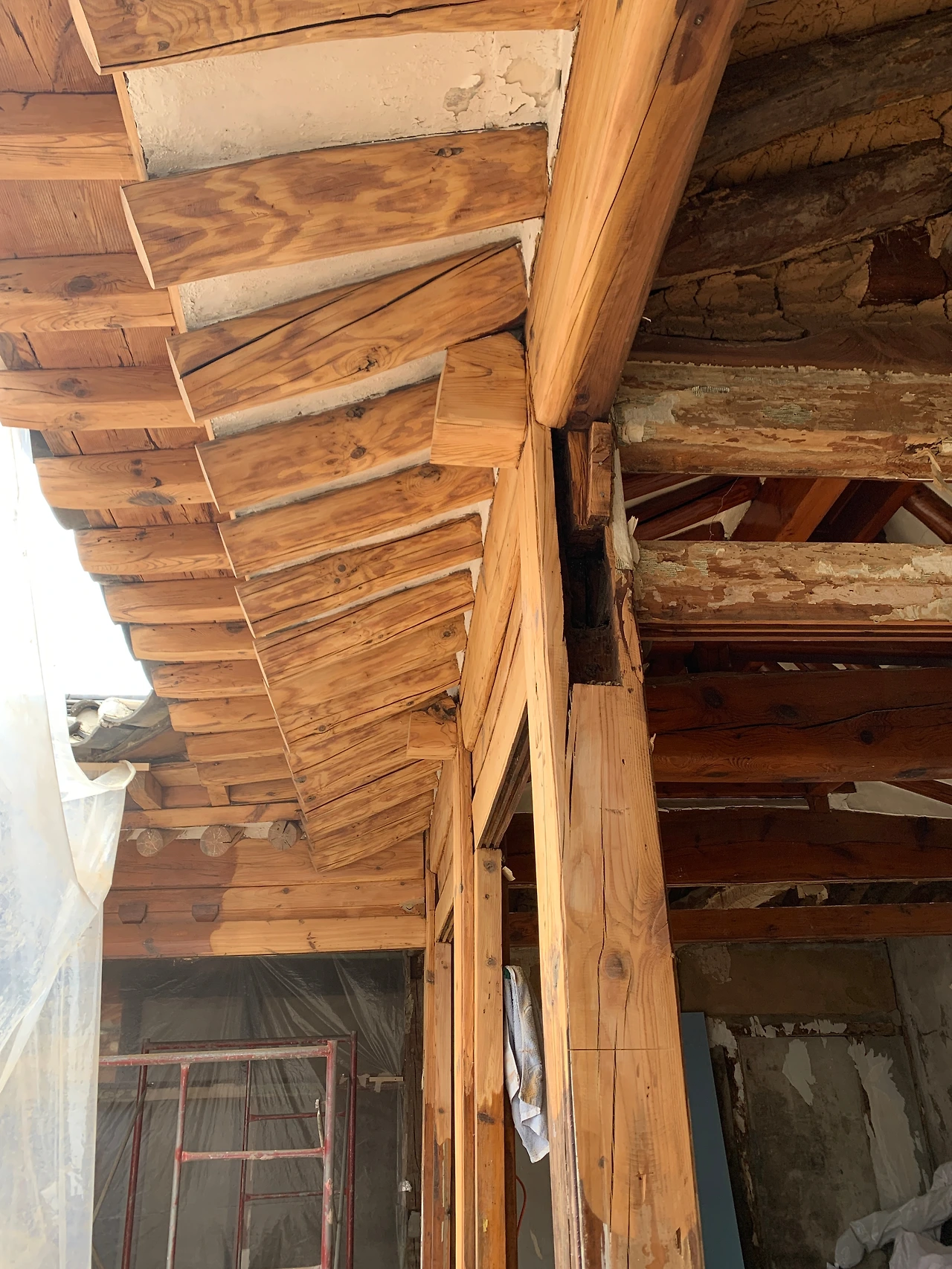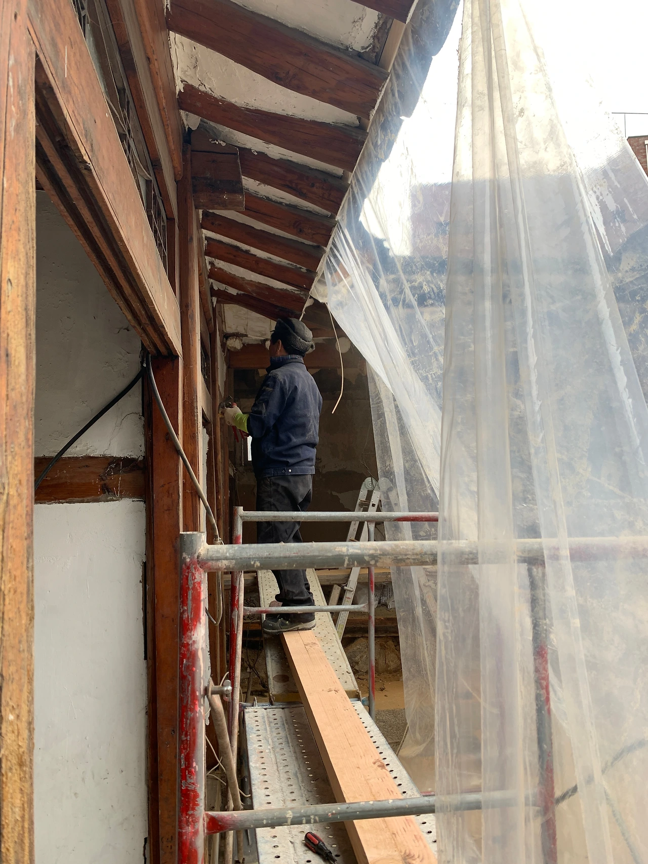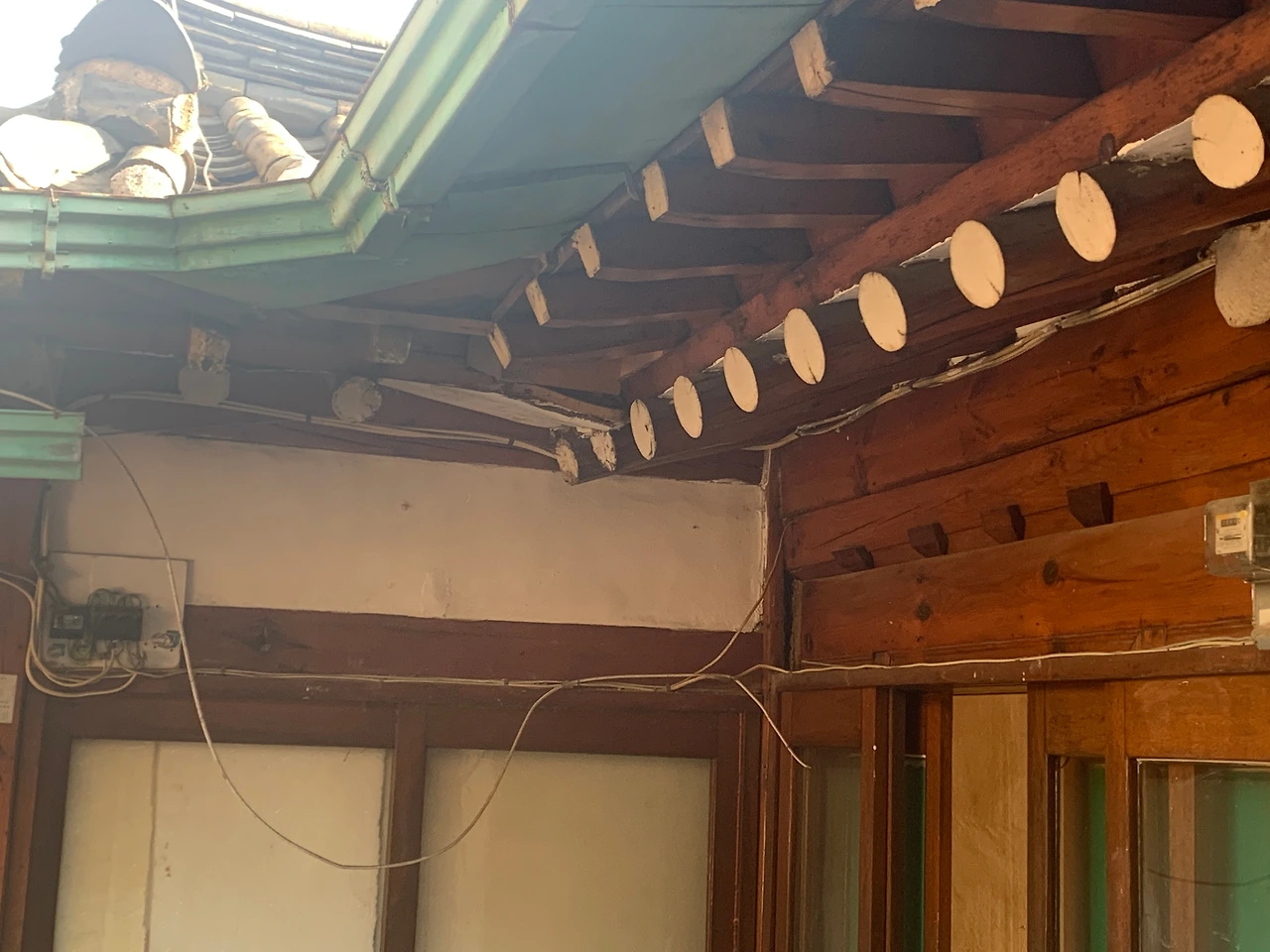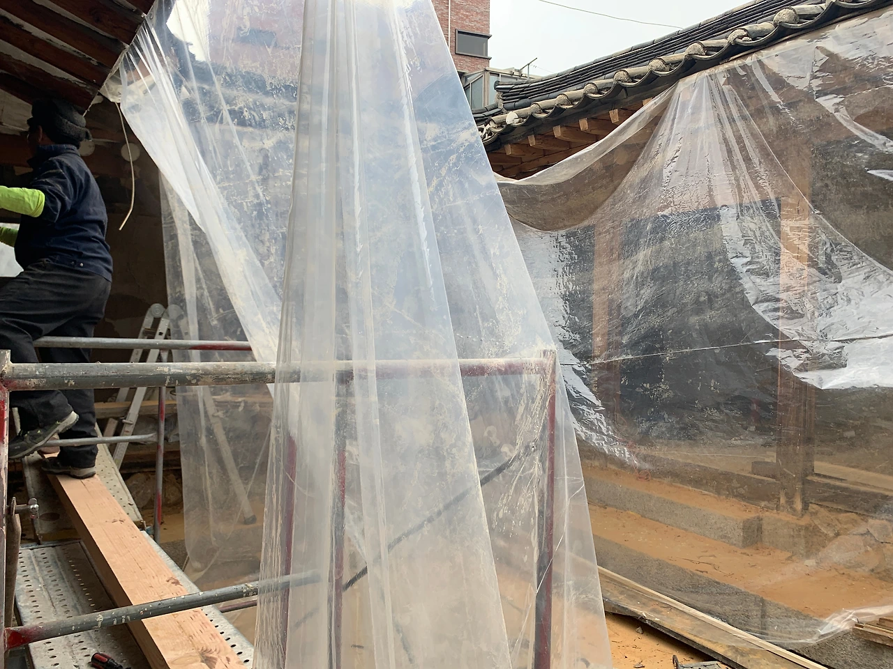 집에는 비닐 장막이 쳐있었다. 먼지가 많이 나기 때문에 쳐 둔 것이다. 작업하시는 분들은 당연히 비닐 장막 안에서 먼지를 맞으며 작업하고 계셨다. 집주인이라고 인사를 드리고 변화된 서까래를 보니 감탄이 절로 나왔다. 깎기의 과정이 살짝 지나간 부분은 붉으죽죽했던 서까래가 연한 베이지색으로 변했다.