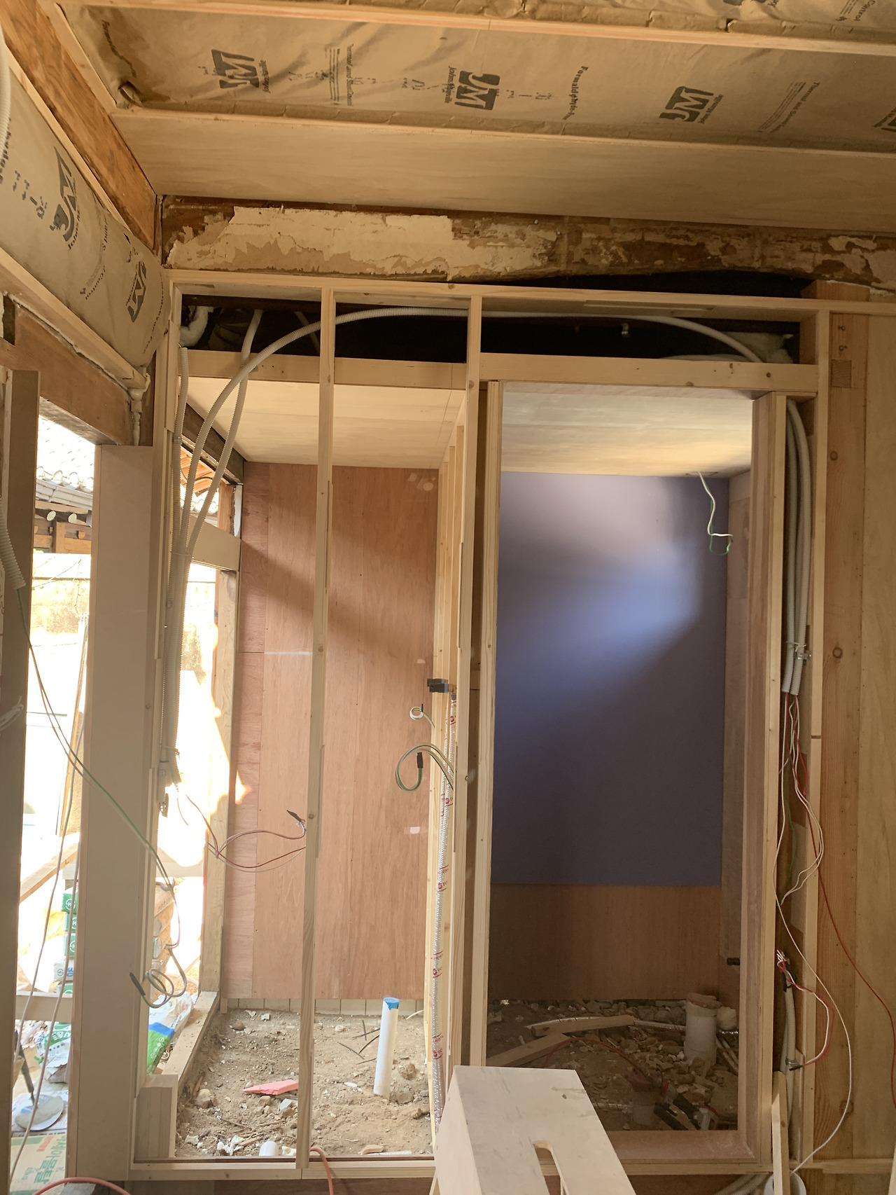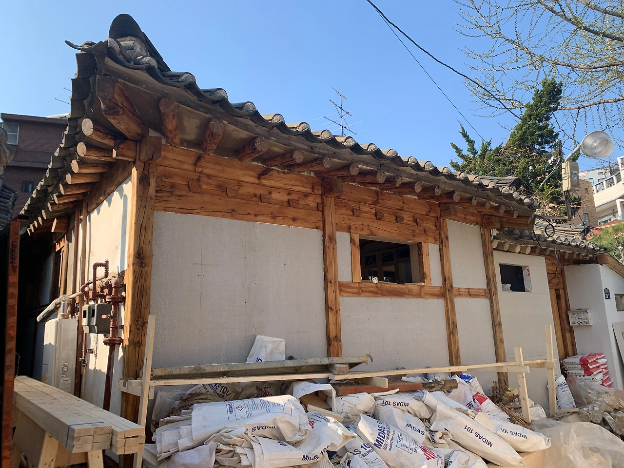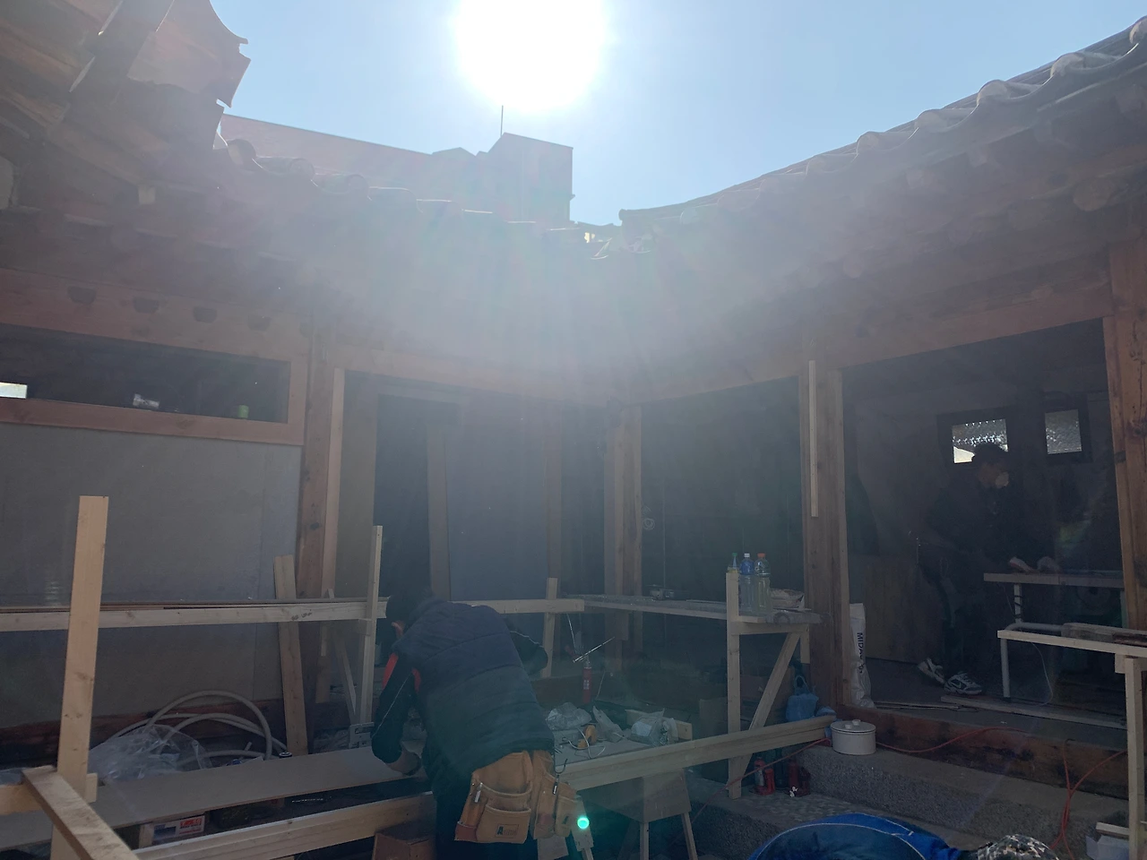 벽체가 없던 집에 벽체가 세워지며 공간이 구성된다. 게스트룸의 욕실과 세탁실의 구획이 완성되었다 게스트룸은 이전 집에선 별채로 세를 놓았던 공간이다. 매우 작은 공간에 주방과 욕실까지 배치해 사용했다. 우린 주방 기능은 없애고 그 공간을 욕실과 세탁실로 나눴다. 이전보다는 넓은 욕실이지만 내겐 좀 작게 느껴진다. 그래도 한옥에서 게스트룸에 단독 욕실을 넣은 것은 잘했다고 자평한다.