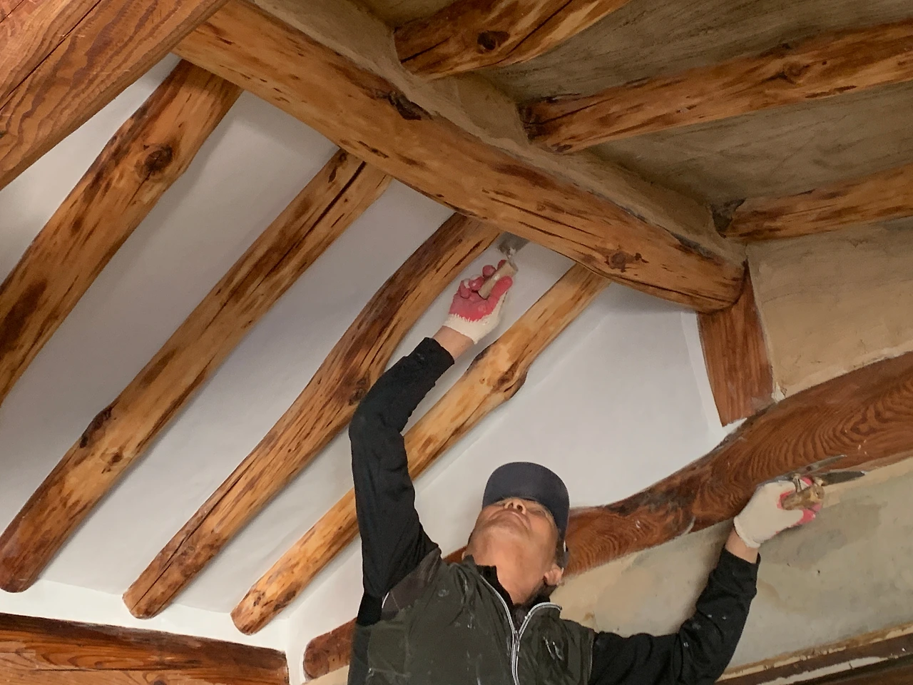 요즘은 집의 골격과 단장이 동시에 진행되고 있다 목수팀은 벽체 등의 골격을, 미장팀은 완성된 후 한옥의 미감을 뽐내게 될 작업이다