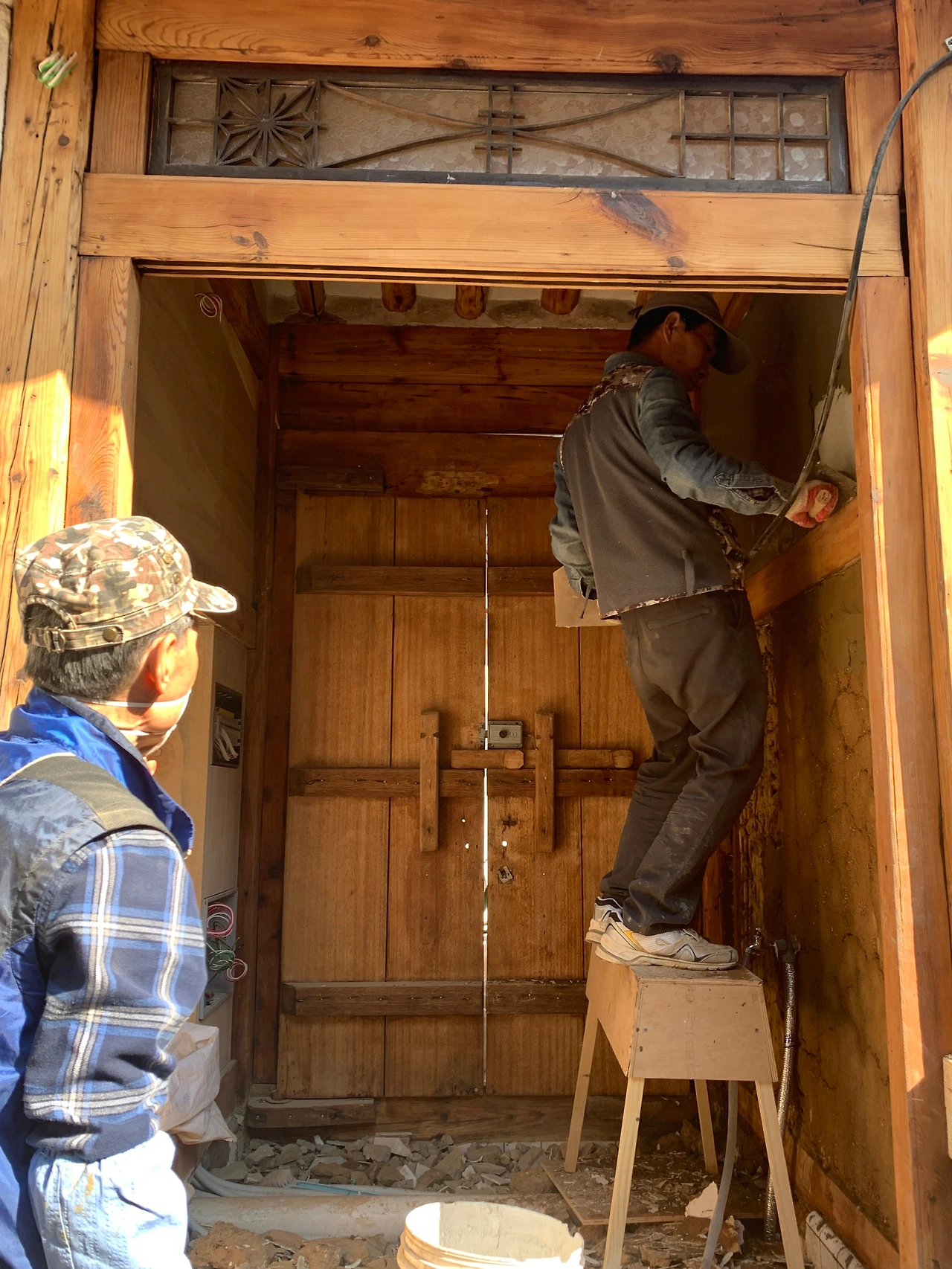 이후엔 외벽 미장이 진행되고 문틀이 확정된다. 우리 집은 미닫이와 여닫이, 한식 창호와 양식 창호를 적절히 사용하고 있다. 대부분 한식 창호를 사용하지만 마당의 손님용 화장실과 게스트룸 욕실 창호는 습기에 강한 양식 창호를 사용한다. 기능과 아름다움을 동시에 만족하기 위한 방법이다. 또한 다양한 한옥을 만드셨던 임정희 목수님의 실용적 판단이 적용되는 것이다.