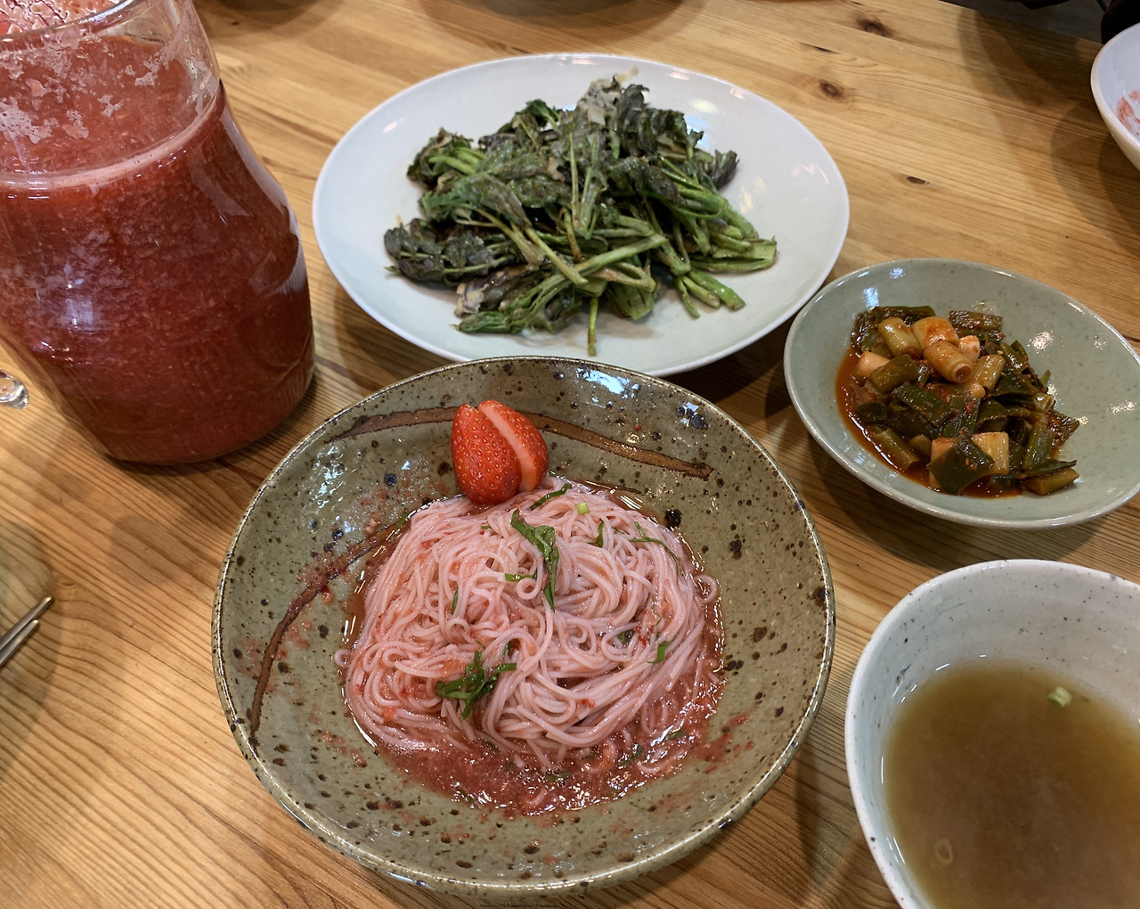 수업에 참여한 수강생들을 위해 선생님께서 차려주신 첫 째날 점심 밥상은 고은정의 제철음식학교에서만 맛볼 수 있는 딸기국수와 가죽나무순전이었다.