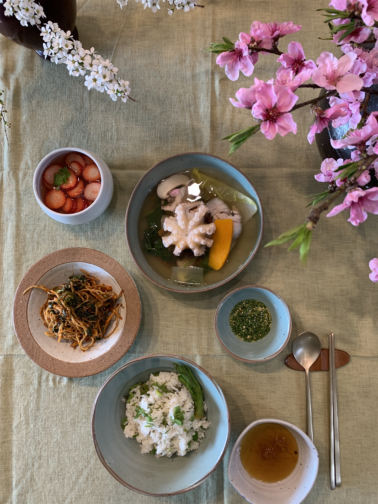 첫 째날엔 기혈의 소통을 돕고 몸의 염증을 내리는 데 효과적인 두릅밥, 산과 들 그리고 바다의 봄을 제대로 느낄 수 있는 나물 듬뿍 주꾸미와 돼지고기 샤부샤부, 몸의 열을 내리고 소염 작용을 하는 쓴나물고추장무침, 새콤함과 달콤함을 선사하는 오미자딸기화채였다.