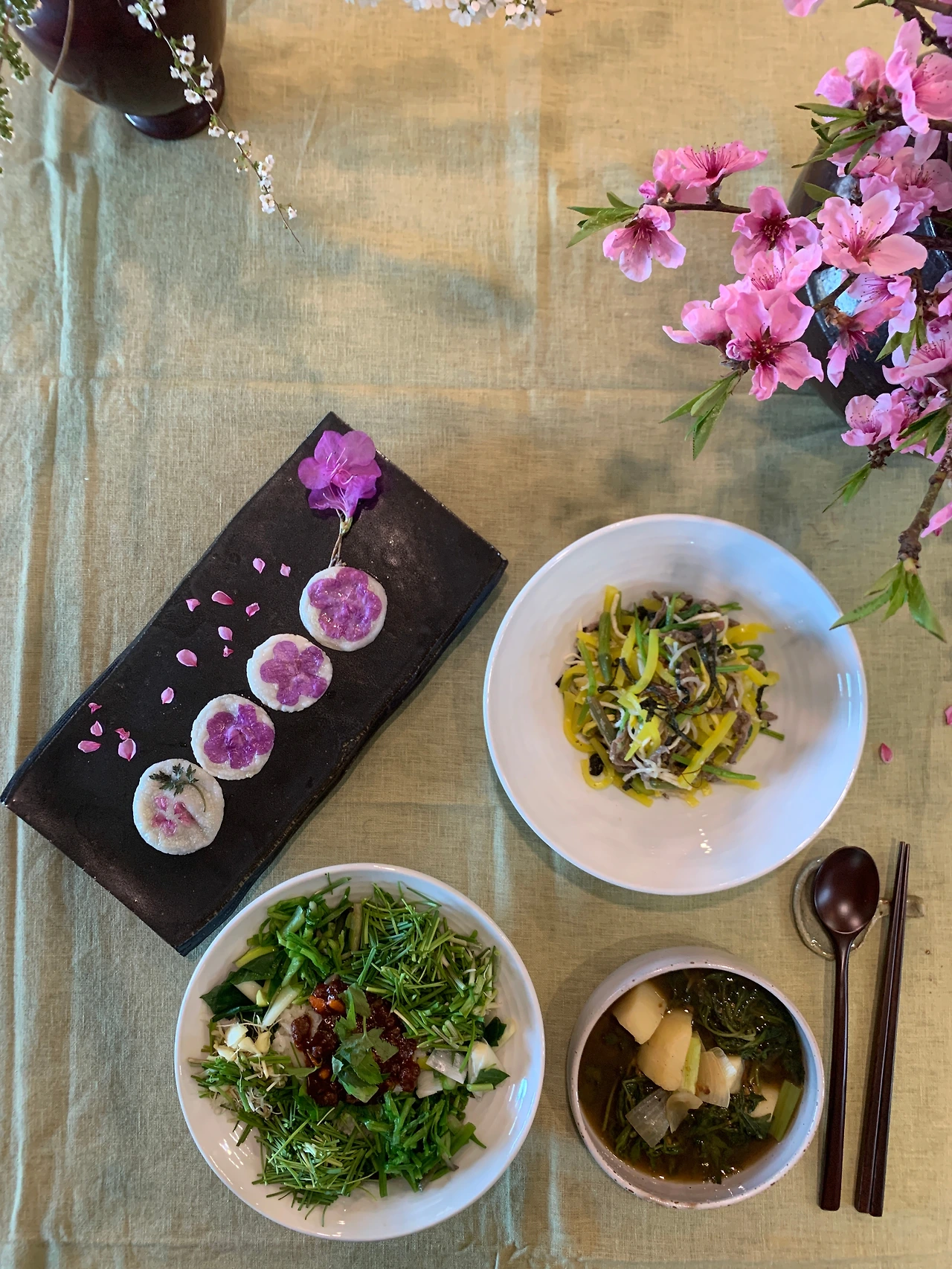 둘 째날은 부추, 달래, 움파, 미나리, 승검초(당귀의 싹) 등 입춘오신반에 약고추장으로 비빈 오신채 비빔밥으로 몸의 독소를 뽑아냈다. 여기에 청포묵과 미나리, 숙주나물을 새콤하게 버무린 탕평채, 찹쌀가루로 버무려 날 선 맛을 잡은 쑥국, 봄 잔치의 결정판 진달래화전으로 차렸다.