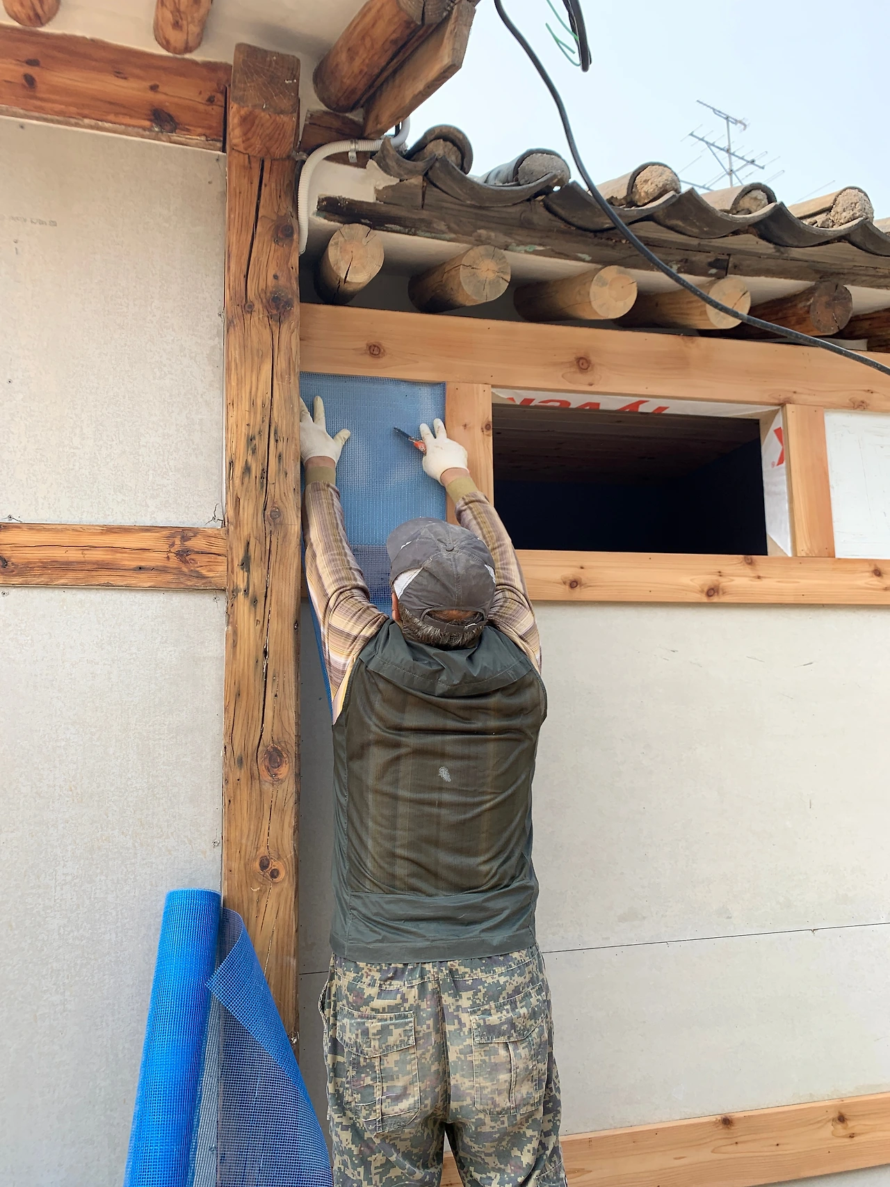 미장 선생님께서 파란 플라스틱 망사를 가지고 계시기에 용도를 여쭸더니 미장 기초시 사이에 넣는 것이라 하셨다. 그래야 미장이 뜨지 않는다 하셨다.
