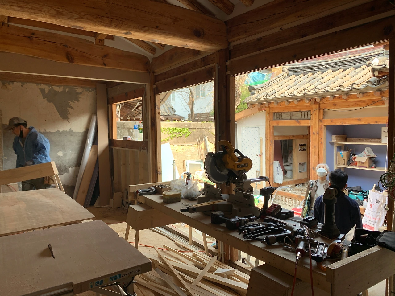 목수님 세 분, 미장님 세 분이 일하셨다.