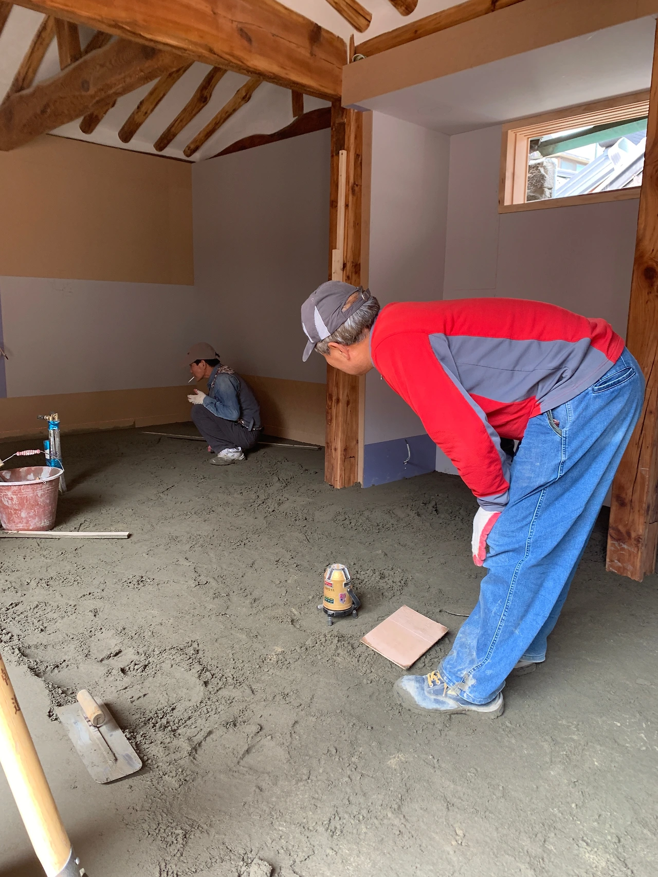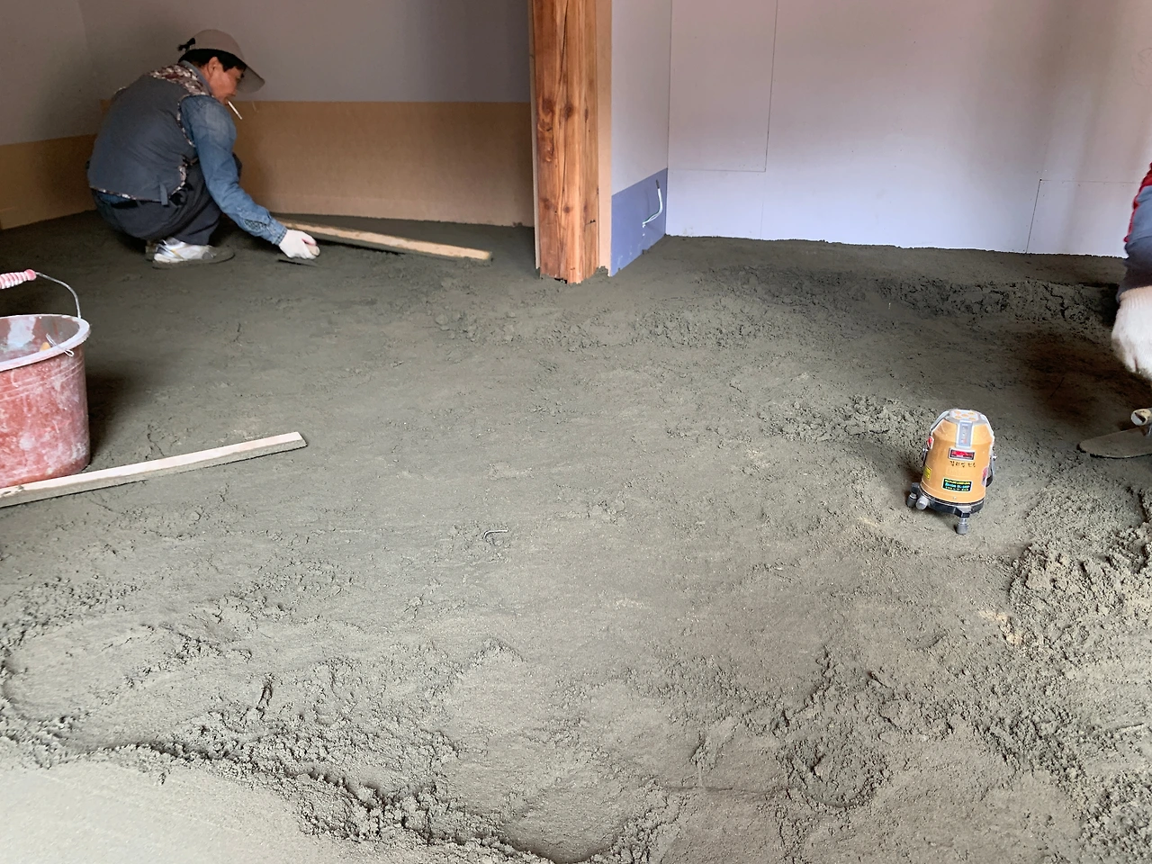 주방과 마루 미장이 진행되었다. 이로써 실내 모든 바닥 기본 공사가 완료되었다. 물론 장판이나 최종 마감은 마치지 않았다. 그것은 바닥이 말라야 진행된다고 한다.