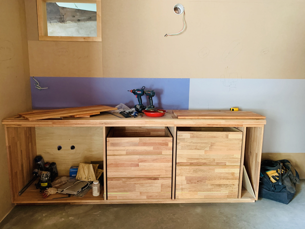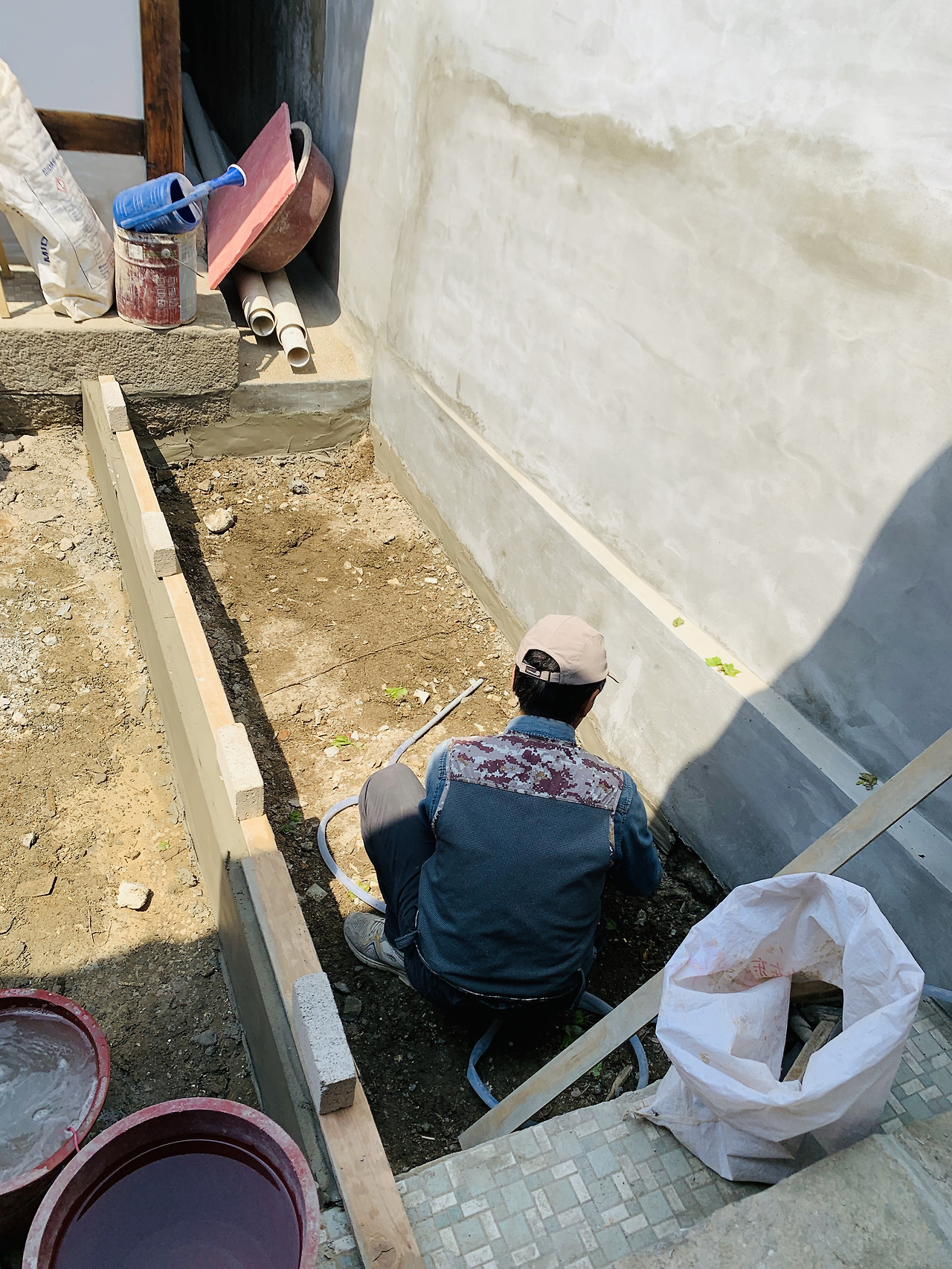 싱크대의 서랍이 만들어지고 화단의 미장이 진행되었다. 수막새로 기와를 마무리할 수는 없지만 솜씨 좋은 미장이 수막새를 대신하고 있었다.